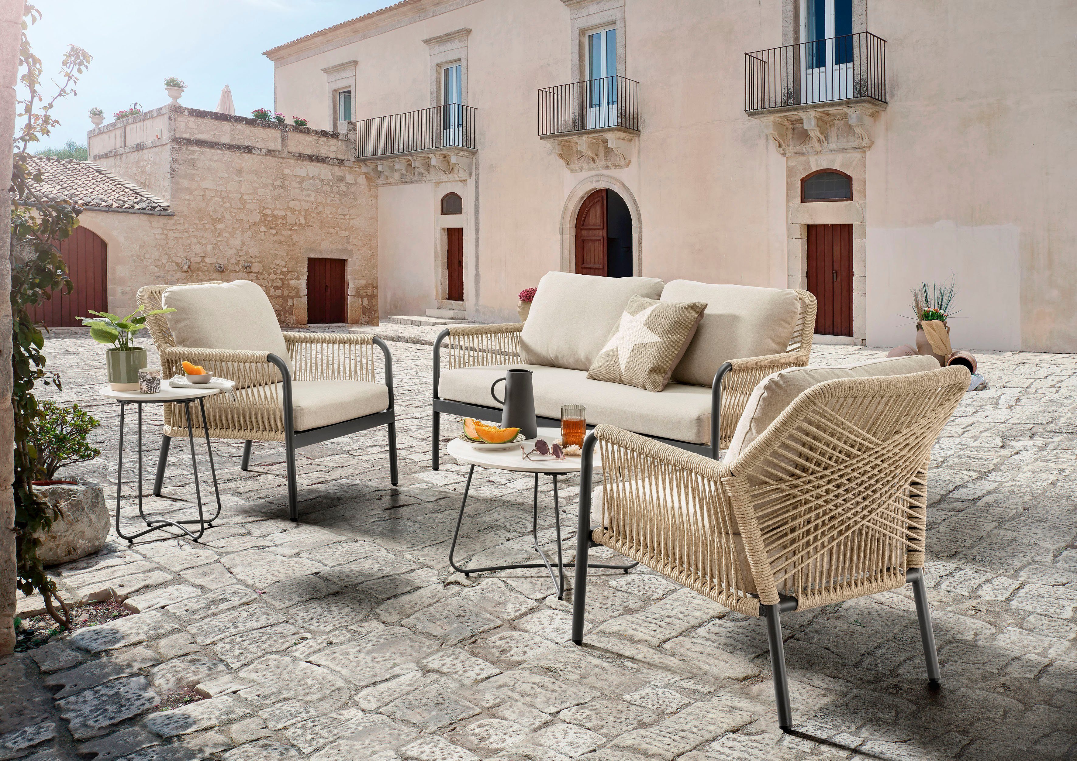 Lieferumfang | 1 x Sofa inkl. Auflagen 1 x Tisch hoch: ⌀60x40 cm / Belastbarkeit 35 kg 1 x Tisch klein: ⌀40x50 cm / Belastbarkeit 25 kg 2x Sessel, inkl. Auflagen Montagematerial und Aufbauanleitung |