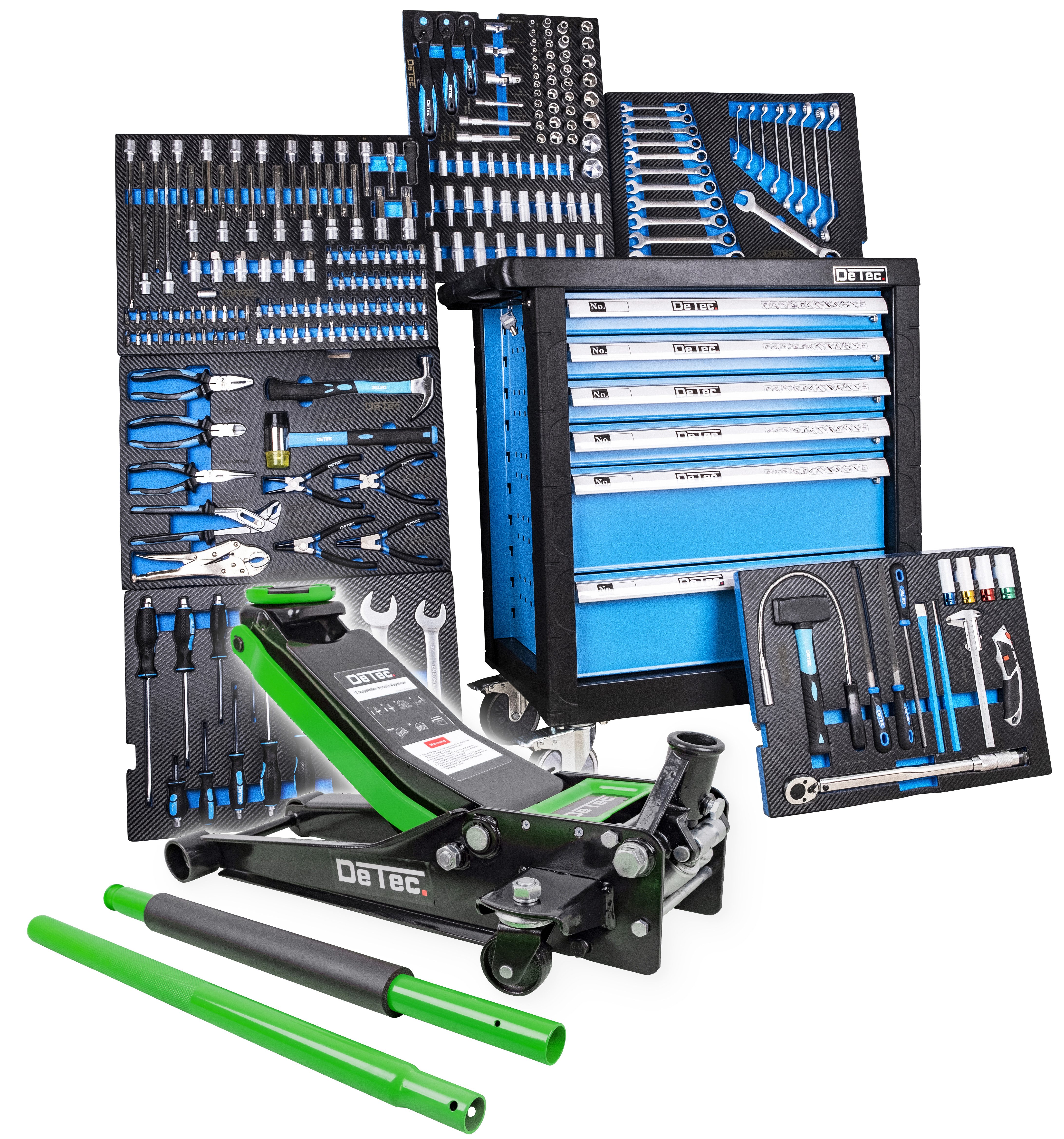 Lieferumfang | Werkstattwagen 6 Schubladen gefüllt mir Werkzeug 3 Tonnen Wagenheber in grün |
