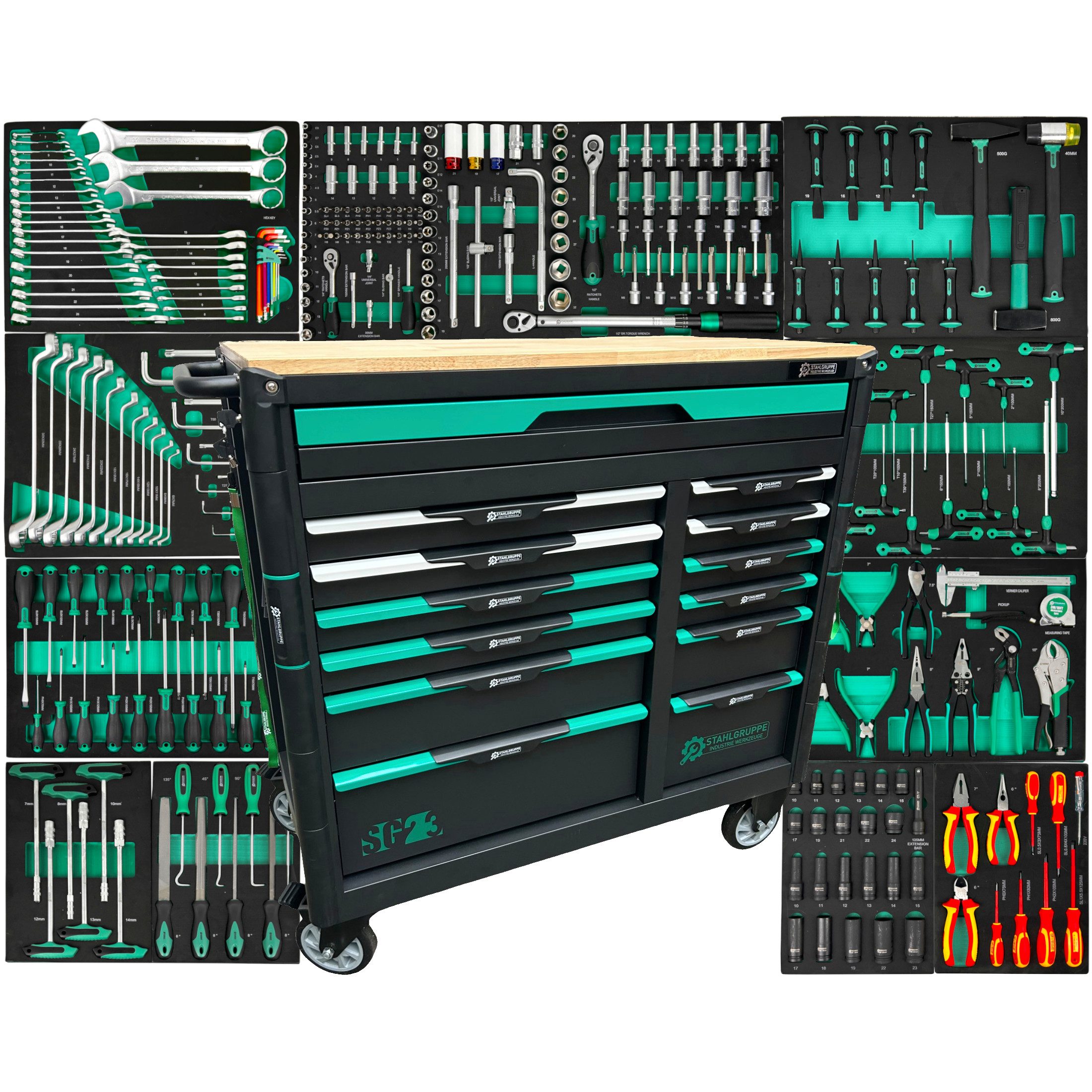 Der Werkzeugwagen Stahlgruppe SG23 gehört zur Luxuslinie für Profis und setzt neue Maßstäbe in Bezug auf Funktionalität und Langlebigkeit. Mit seinen 13 stabilen Schubladen, von denen 11 bereits mit einem beeindruckenden 294-teiligen Werkzeugsatz gefüllt sind, erfüllt dieser Wagen alle Ansprüche eines gut organisierten und professionellen Arbeitsplatzes.