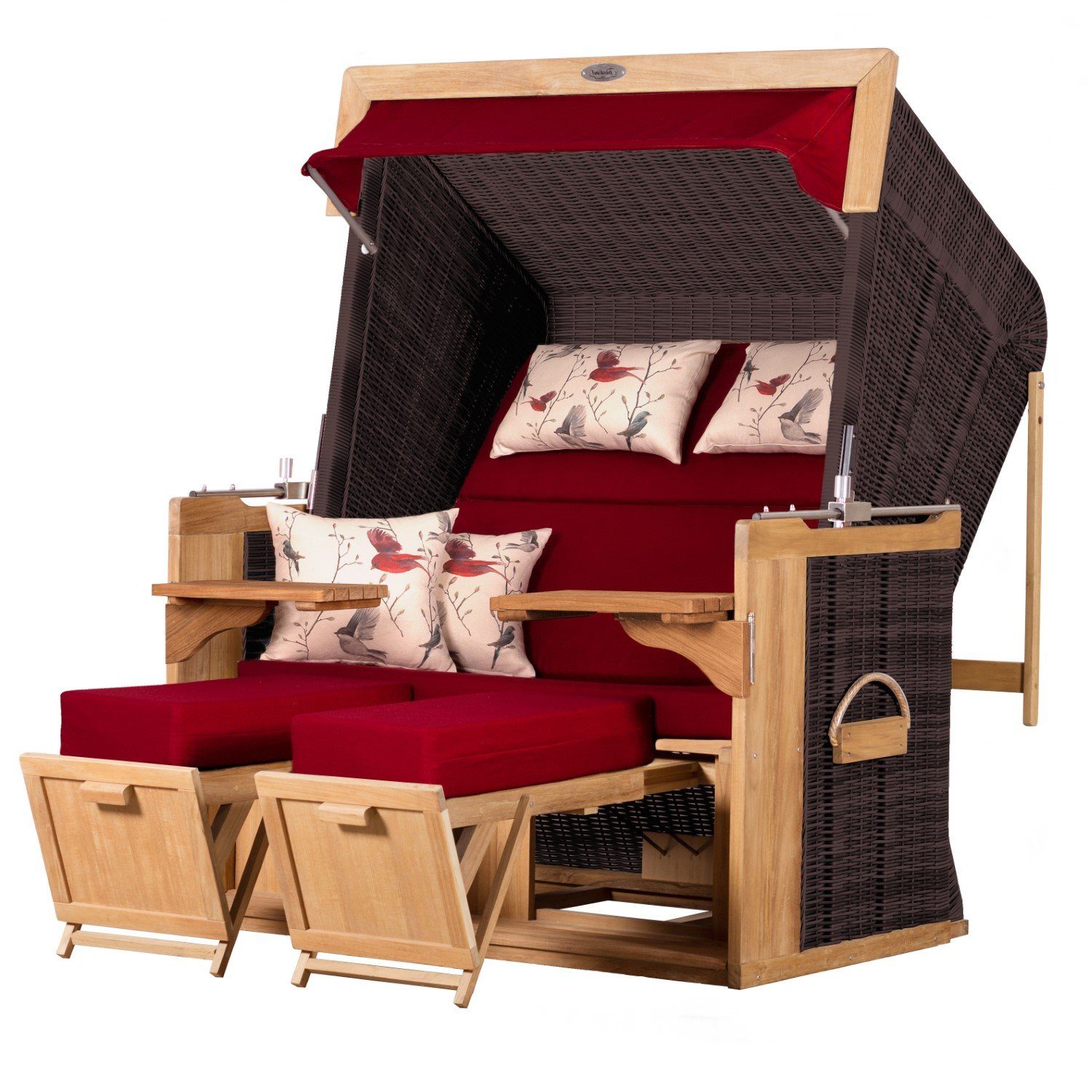 Die Bezüge des deVries Nordsee-Strandkorbes sind aus Acryl gefertigt und für den Außeneinsatz hervorragend geeignet. Die uni-rote Polsterung wird gekonnt durch die Musterung der Kissen in Szene gesetzt. Die ebenfalls uni-rote Sonnenmarkise wird mit der Teakholz-Zierblende zum Hingucker. Die eingearbeitete Windschutzfolie sorgt auch in den Abendstunden dafür, dass störende Zugluft Ihre Entspannung nicht trübt.