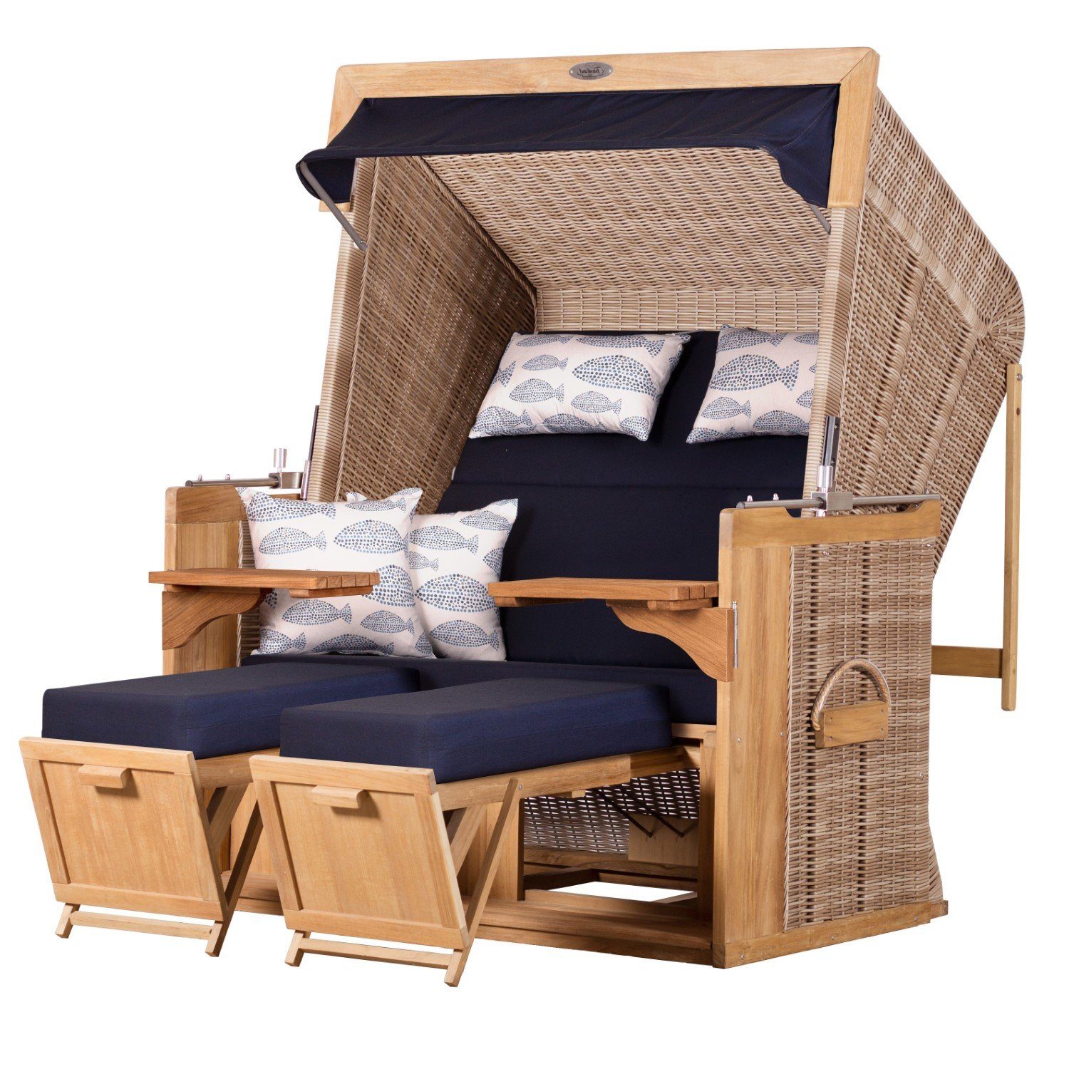 Komfort für Ihre Wellness-OaseDie Bezüge des deVries Nordsee-Strandkorbes sind aus Polyester gefertigt und für den Außeneinsatz hervorragend geeignet. Die uni-blaue Polsterung wird gekonnt durch die hellen Kissen mit Fisch-Druck in Szene gesetzt. Die ebenfalls blaue Sonnenmarkise wird mit der Teakholz-Zierblende zum Hingucker. Die eingearbeitete Windschutzfolie sorgt auch in den Abendstunden dafür, dass störende Zugluft Ihre Entspannung nicht trübt.
