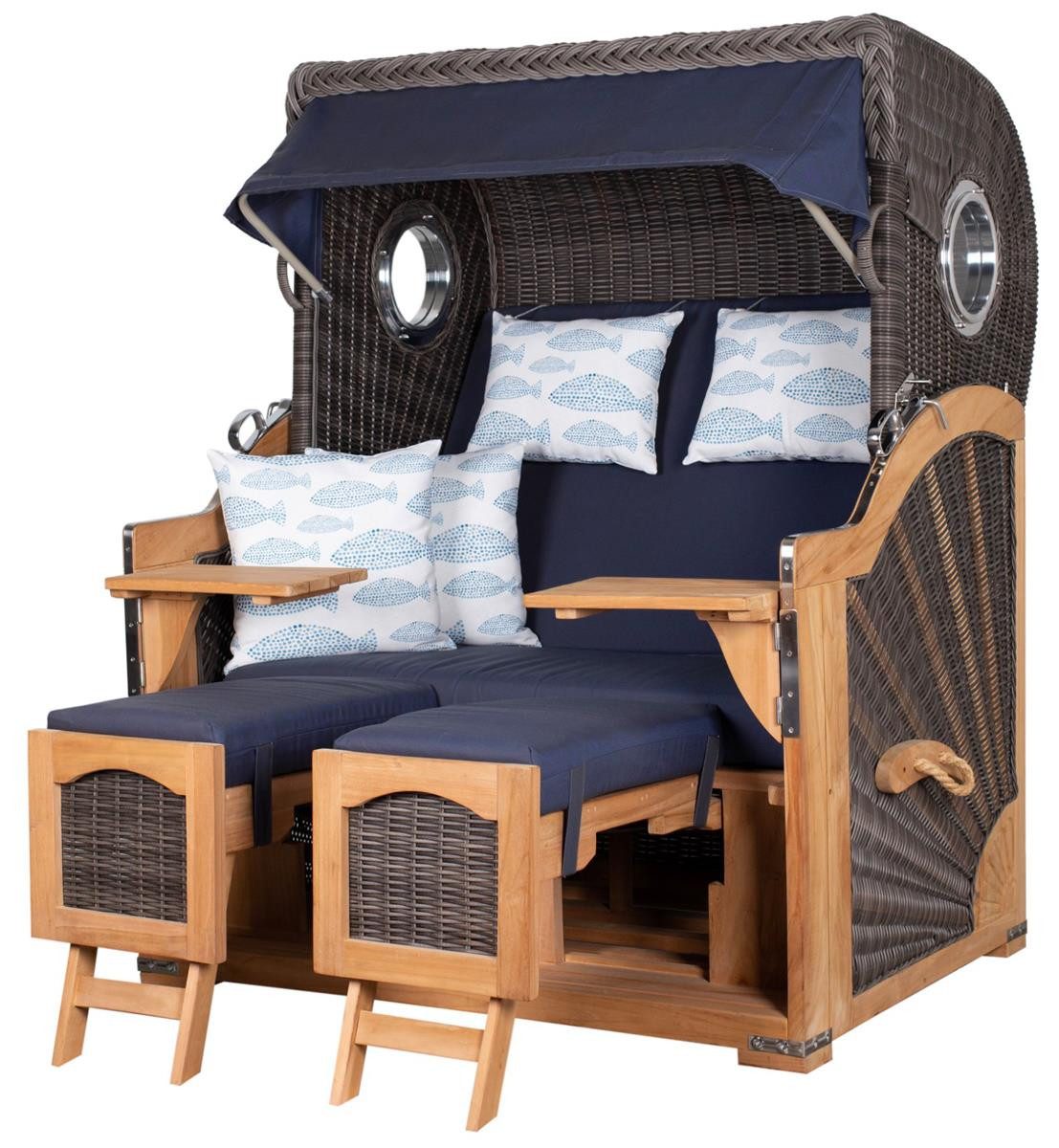 Das Wichtigste auf einen BlickLehnen Sie sich im Strandkorb Seemöwe XL zurück und genießen den herrlichen Komfort von Teakholz und witterungsbeständigem PE-Geflecht und erfreuen Sie sich an der wichen Polsterung. Mit der mitgelieferten Schutzhaube schützen Sie Ihren neuen Strandkorb optimal gegen Wind und Wetter.