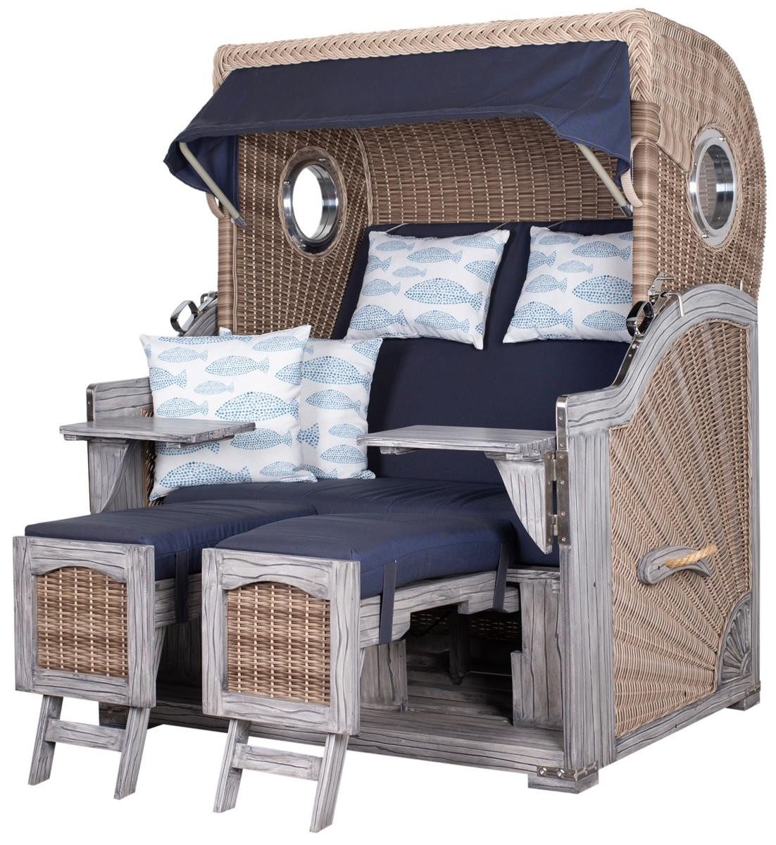 Liebe zum DetailDiese zeigt sich in jedem Element dieses Strandkorbs. Aluminium-Bullaugen fangen das schimmernde Sonnenlicht ein und verleihen dem Vintage-Look einen Hauch von maritimer Romantik. Die bei diesem Modell bereits eingebauten Rückholfedern ermöglichen es Ihnen, mühelos die perfekte Position zu finden – lehnen Sie sich zurück, schließen die Augen und genieße Sie Ihre Auszeit vom Alltag.