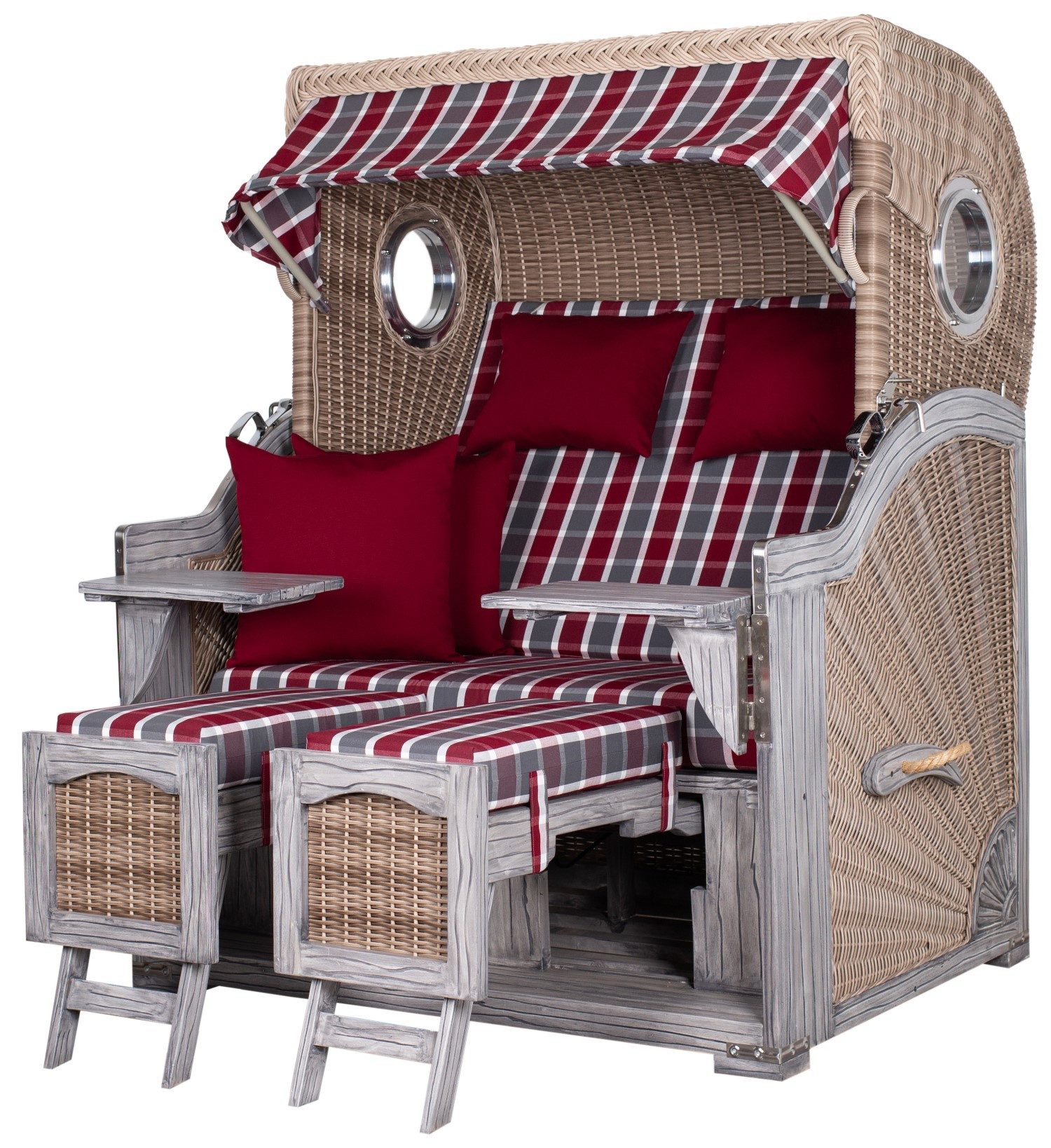 Liebe zum DetailDiese zeigt sich in jedem Element dieses Strandkorbs. Aluminium-Bullaugen fangen das schimmernde Sonnenlicht ein und verleihen dem Vintage-Look einen Hauch von maritimer Romantik. Die bei diesem Modell bereits eingebauten Rückholfedern ermöglichen es Ihnen, mühelos die perfekte Position zu finden – lehnen Sie sich zurück, schließen die Augen und genieße Sie Ihre Auszeit vom Alltag.