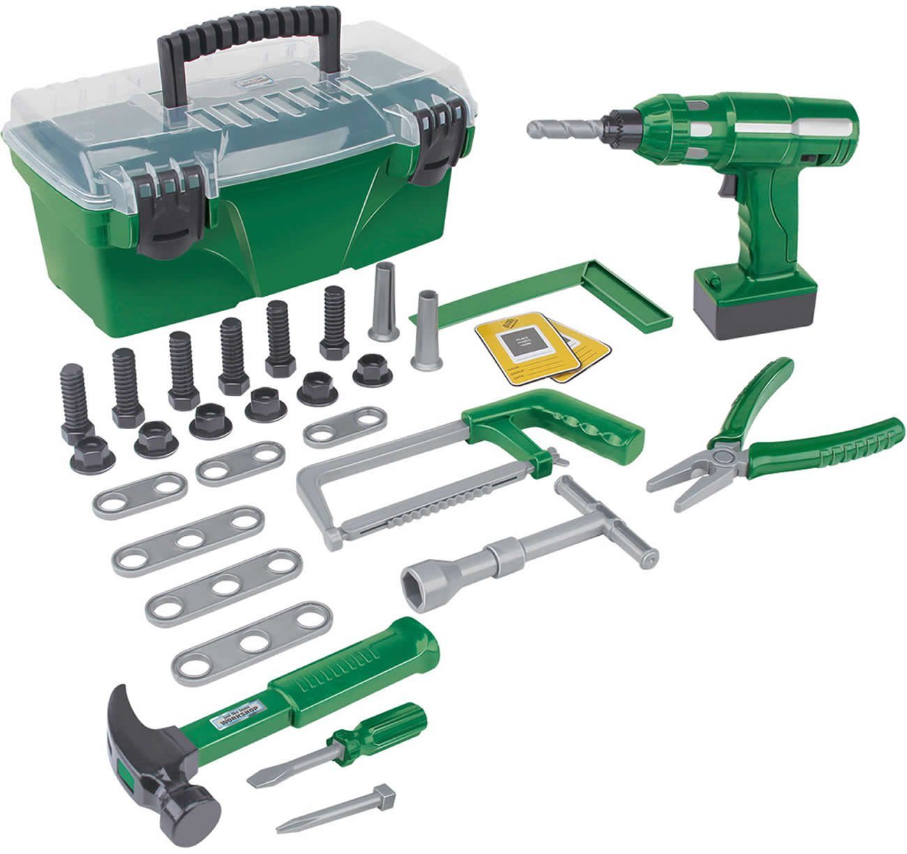 Bohren und Schrauben wie ein Profi!!! Dieser Kinder Werkzeug-Koffer in einer originalgetreuen, kindgerechten Nachbildung ist mit allem ausgestattet, was kleine Handwerker benötigen. Ob Akku-Bohrschrauber, Hammer oder Winkelmesser - alles ist im Umfang enthalten. Nachwuchshandwerker können erste handwerkliche Fähigkeiten (völlig ungefährlich) entwickeln...stundenlanger Spielspaß ist garantiert. Praktisch - nach dem Spielen kann alles wieder ordentlich in dem Koffer verstaut werden. Los geht's...der Einsatz kann beginnen.