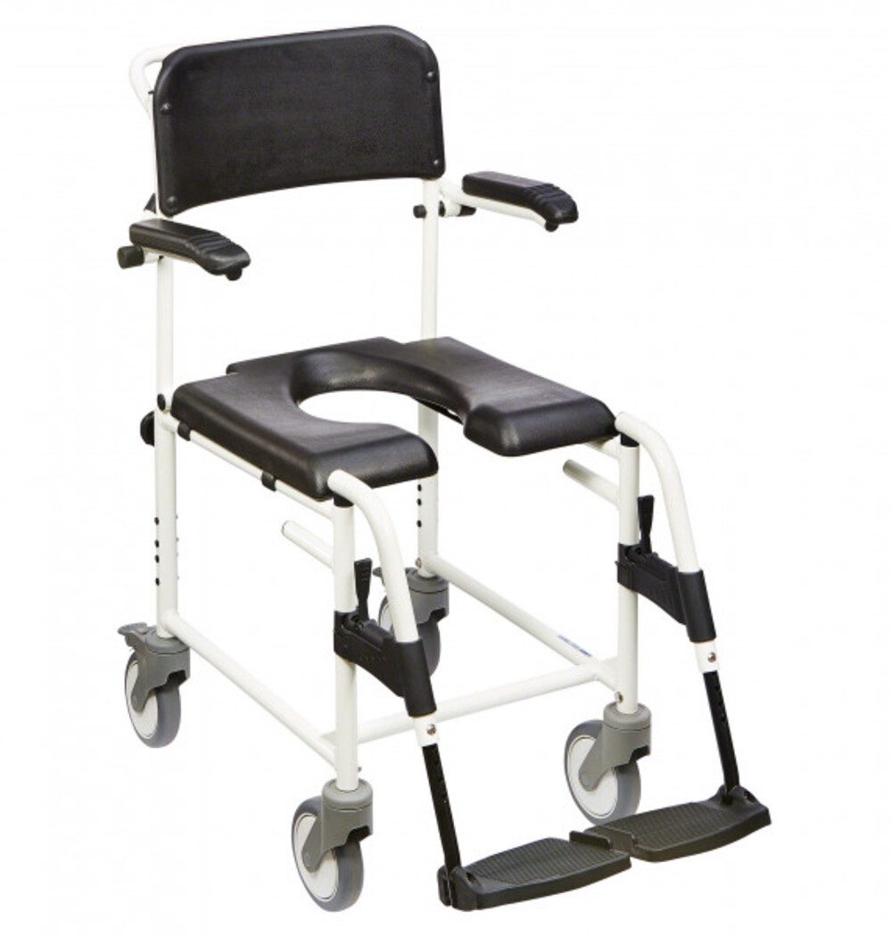 Опис товару (ми ще працюємо над перекладом, вибачте за незручності): Duschtoilettenstuhl Levina 320-2 Der Duschtoilettenstuhl Levina 320-2 setzt neue Maßstäbe in Komfort und Funktionalität für Menschen, die Unterstützung bei der Körperpflege benötigen. Dieses hochentwickelte Hilfsmittel bietet eine Kombination aus durchdachtem Design, hochwertigen Materialien und einer benutzerfreundlichen Handhabung, die sowohl Pflegepersonal als auch Anwender schätzen werden. Der robuste pulverbeschichtete Aluminiumrahmen gewährleistet eine hohe Stabilität und Langlebigkeit, während das leichte Gewicht den Transport und die Handhabung des Stuhls erleichtert. Ob in der Dusche oder am Toilettenplatz, der Levina 320-2 ist stets einfach zu bewegen und zu positionieren. Komfort und Ergonomie Ein herausragendes Merkmal dieses Modells ist die gepolsterte Sitzfläche, die in Kombination mit der ergonomisch geformten Rückenlehne für einen hohen Sitzkomfort sorgt. So können Anwender längere Zeit bequem sitzen, was besonders wichtig für Personen mit Mobilitätseinschränkungen ist. Die gepolsterten Armlehnen bieten zusätzlichen Halt und Sicherheit, während die Beinstützen abgeschwenkt werden können, um den Zugang zum Stuhl zu erleichtern. Flexibilität und Sicherheit Die vier 5-Zoll-Schwenkrollen ermöglichen eine mühelose Fortbewegung des Stuhls, und zwei der Rollen sind mit Totalfeststellern ausgestattet, um den Stuhl bei Bedarf sicher zu fixieren. Dies ist besonders wichtig in der Dusche oder auf nassen Oberflächen, wo ein fester Stand unerlässlich ist. Ein weiteres praktisches Feature ist das höhenverstellbare Fußbrett, das sich leicht an die individuellen Bedürfnisse des Benutzers anpassen lässt. Diese Flexibilität trägt dazu bei, dass der Levina 320-2 für eine Vielzahl von Körpergrößen geeignet ist und eine bequeme Nutzung gewährleistet.