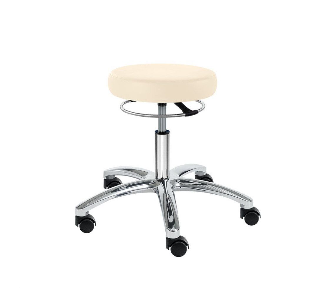Ergonomischer Drehhocker mit Ringauslösung zur stufenlosen Höhenverstellung von 47–60 cm – ideal für flexible Arbeitspositionen im medizinischen oder kosmetischen Bereich.