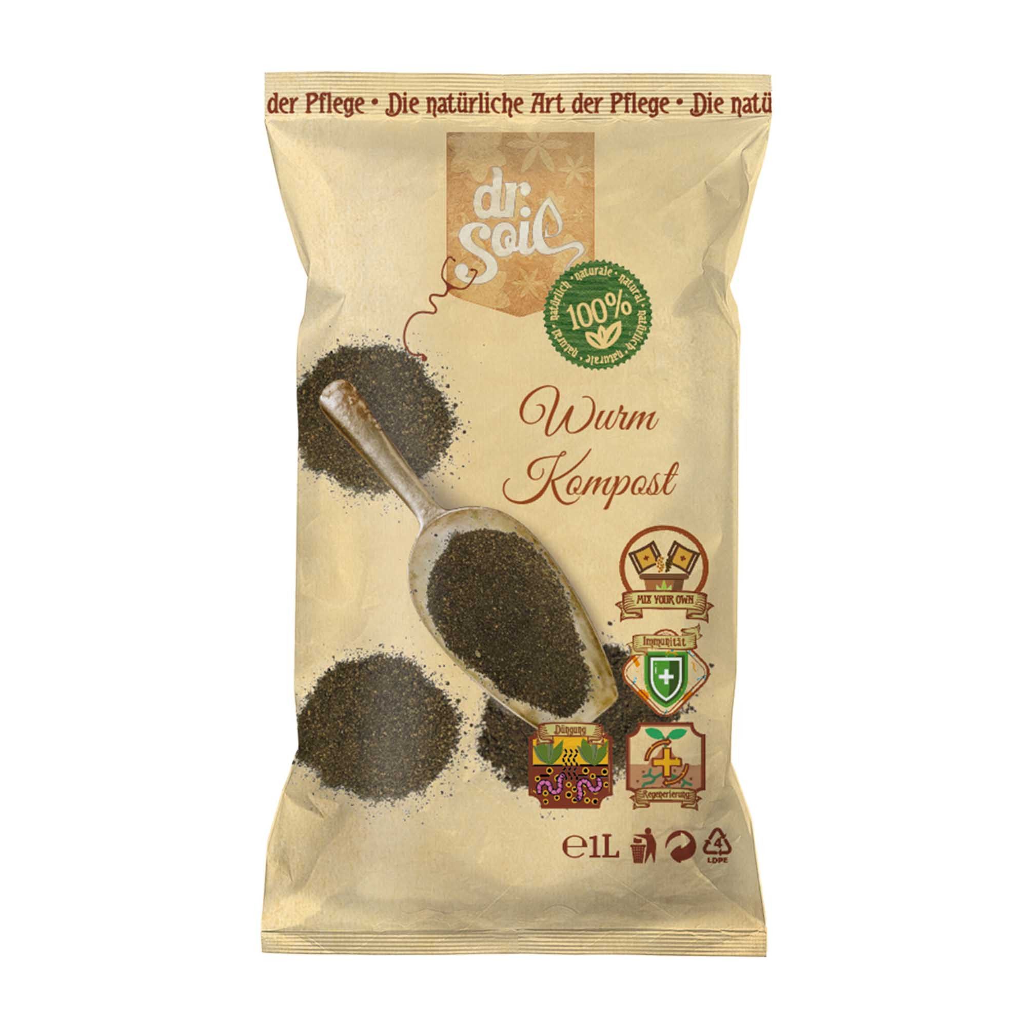 Revitalizieren Sie Ihren Garten mit Dr.Soil Wurmkompost 1l – Der natürliche Booster aus unserer "Mische DEIN Substrat" Kollektion! Steigern Sie die Fruchtbarkeit Ihres Gartens auf natürliche Weise mit Dr.Soil Wurmkompost, einem unverzichtbaren Bestandteil unserer "Mische DEIN Substrat" Reihe. Dieser erstklassige Wurmkompost ist das Ergebnis einer sorgfältigen Kompostierung, die Ihren Pflanzen eine reichhaltige Quelle an Nährstoffen und Mikroorganismen bietet. Vorteile des Dr.Soil Wurmkompost: Nährstoffreicher Boden: Versorgt Ihre Pflanzen mit allen wesentlichen Nährstoffen, die für ein gesundes Wachstum erforderlich sind. Förderung des Wurzelwachstums: Die feine Struktur des Komposts erleichtert das Wurzelwachstum und die Nährstoffaufnahme. Verbesserung der Bodenstruktur: Fördert eine gute Drainage und Belüftung des Bodens, was zu kräftigeren und gesünderen Pflanzen führt. Natürliche Bodenverbesserung: Trägt zur Erhöhung der biologischen Aktivität im Boden bei und fördert die Bildung von Humus. Umweltfreundlich: Gewonnen aus organischem Material, bietet eine nachhaltige Lösung zur Steigerung der Bodenqualität. Als Teil der "Mische DEIN Substrat" Kollektion ermöglicht Ihnen Dr.Soil Wurmkompost, Ihr eigenes, perfekt abgestimmtes Substrat zu kreieren. Diese Flexibilität ist ideal für alle Gartenprojekte, von Gemüsebeeten über Blumenarrangements bis hin zu Zimmerpflanzen, und bietet eine natürliche Alternative zu chemischen Düngemitteln. Warum "Mische DEIN Substrat"? Kreativität: Gestalten Sie einzigartige Bodenmischungen, die genau auf die Bedürfnisse Ihrer Pflanzen abgestimmt sind. Qualität: Jedes Produkt in unserer Kollektion ist von höchster Qualität und sorgt für optimale Ergebnisse. Einfachheit und Spaß: Die Erstellung Ihrer eigenen Substratmischung ist nicht nur einfach, sondern auch ein vergnügliches Gartenprojekt. Mit Dr.Soil Wurmkompost in Ihrer "Mische DEIN Substrat" Mischung geben Sie Ihren Pflanzen das, was sie für ein üppiges, gesundes Wachstum benötigen. Erleben Sie die Freude an kräftigen Pflanzen und einer blühenden Gartenlandschaft, unterstützt durch die Kraft der Natur. Setzen Sie auf natürliche Stärke für Ihren Garten – mit Dr.Soil Wurmkompost. Beginnen Sie noch heute!