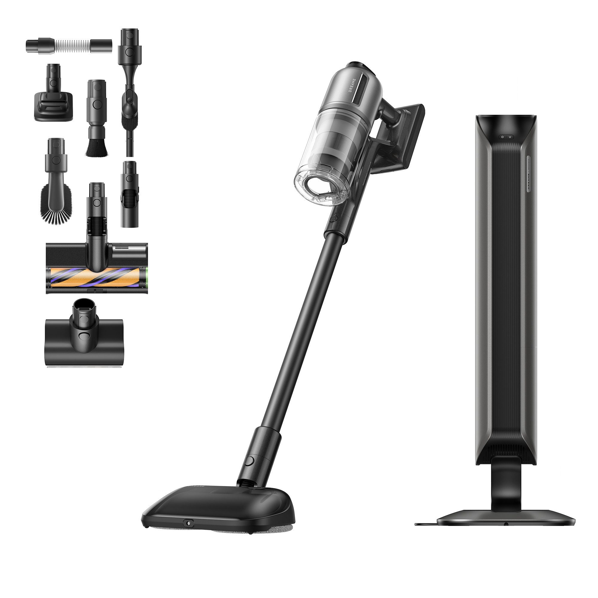 Mitgeliefertes Zubehör | Reinigungsstation (mit Staubbeutel), Multi-Bürste mit Beleuchtung, Elektrische Mini-Bürste, Kombinationswerkzeug, Rotierende weiche Staubbürste, Fellpflegetool, Rotierender Sprüh-Wischmopp (mit Wischer-Pads), Ersatz-Wischer-Pads (1 Paar), Weiche Staubbürste, Verlängerungsstab, Flexibler Adabter, Verlängerungsschlauch, Ersatz-Staubbeutel, Ersatz-Akku, Halterung für Zubehör (1 Stützstange, 1 Staubhalterung), Messbecher |