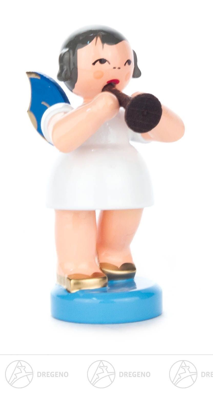 Dregeno Erzgebirge Engelfigur Engel mit Flöte stehend, blaue Flügel Höhe ca 5,5 cm NEU