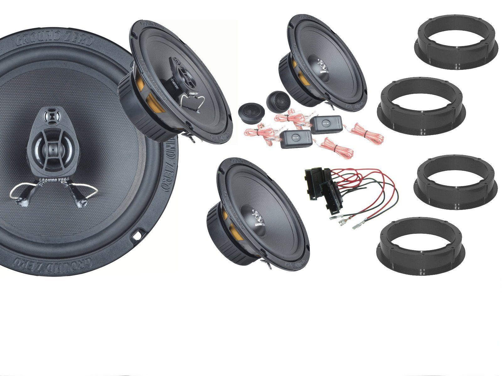 Lieferumfang | 1x Ground Zero koaxial Lautsprecher 1x Ground Zero komponenten Lautsprecher 1x Lautsprecheradapterringe 1x Adapter Stecker |