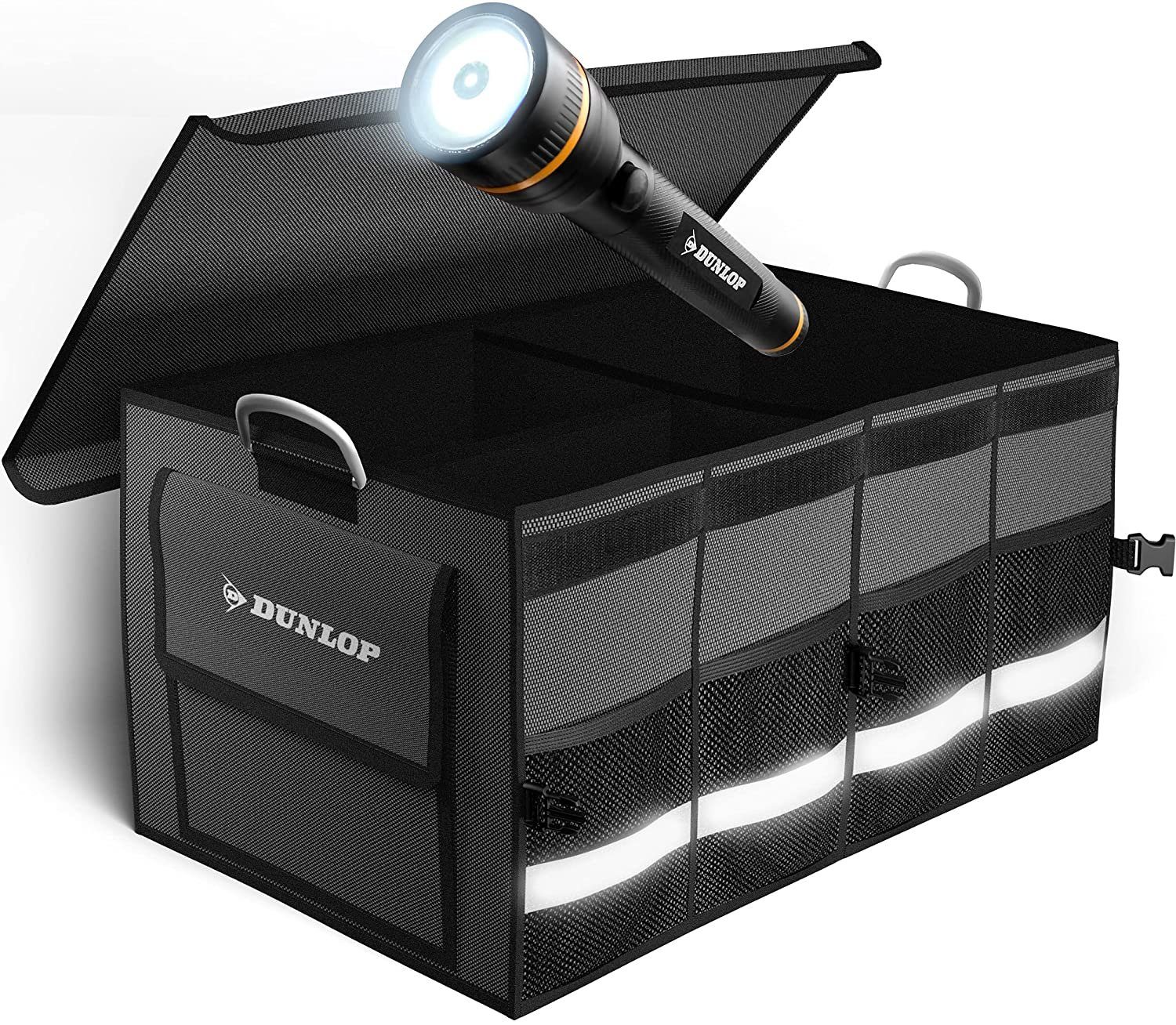 Mit der Dunlop Kofferraumtasche haben Sie sofort Ordnung im Auto. Nichts fliegt mehr umher und alles bleibt an seinem Platz. Die Innfächer können sie mittels stabiler Klett Technik nach ihrem Wunsch anpassen. Praktisch und klein zusammengeklappt können Sie den großen Kofferraum Organizer auch im Einkaufswagen transportieren und an der Kasse perfekt einräumen. Flüssigkeiten laufen nicht aus, die Eierpackung wird nicht gequetscht und die Einkäufe können schön sicher nach Hause transportiert werden. Umherfliegende Einkaufstüten schon nach der ersten Kurve gehören jetzt der Vergangenheit an. Der Deckel der Kofferraumtasche hilft, dass auch beim Bremsvorgang alles an seinem Platz bleibt.