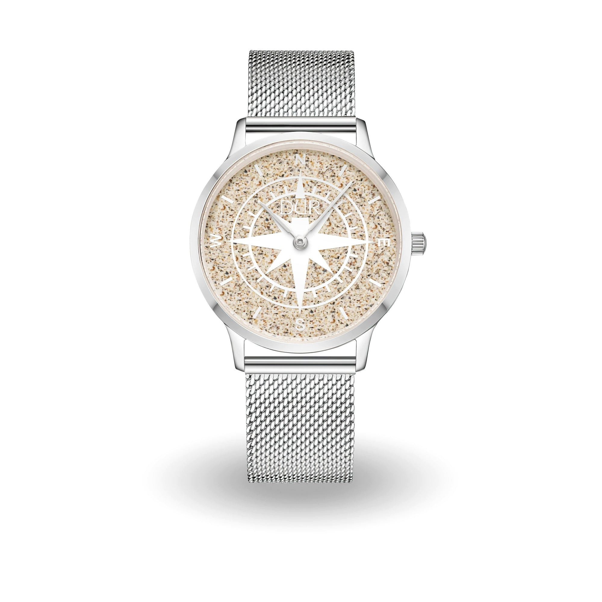 DUR Schmuck Uhr "Kompass", wasserdichte Edelstahl DUR Watch mit Saphirglas und polierten Zeigern in Schwertform. Auf dem Ziffernblatt eine horizontal mattierte Kompassrose die mit Strandsand gefüllt ist. An einem 18 mm breitem Edelstahl Meshband. Durch die mattierte Ausführung lässt sich die Uhrzeit deutlich besser ablesen.