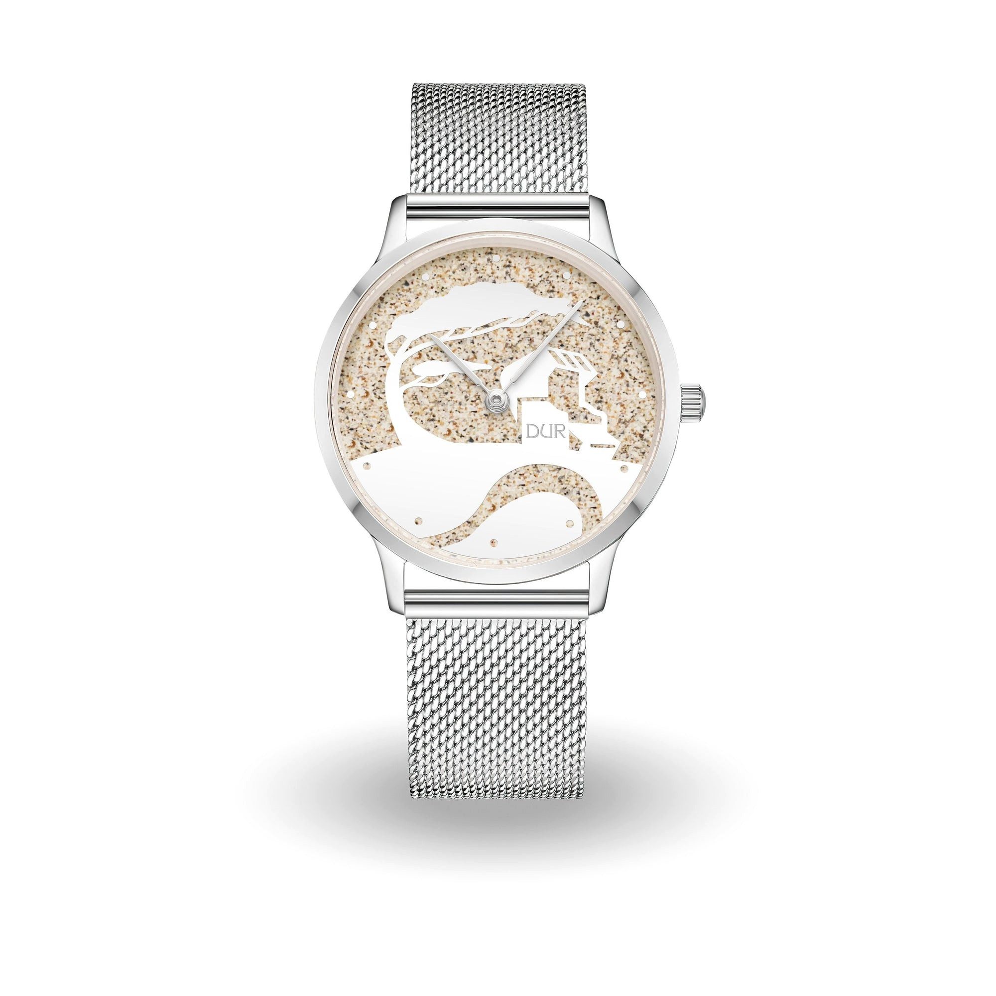 DUR Schmuck Uhr "Küste", wasserdichte Edelstahl DUR Watch mit Saphirglas und polierten Zeigern in Schwertform. Auf dem Ziffernblatt ein horizontal mattierter Windflüchter und ein Strandkorb, mit Strandsand gefüllt. An einem 18 mm breitem Edelstahl Meshband.