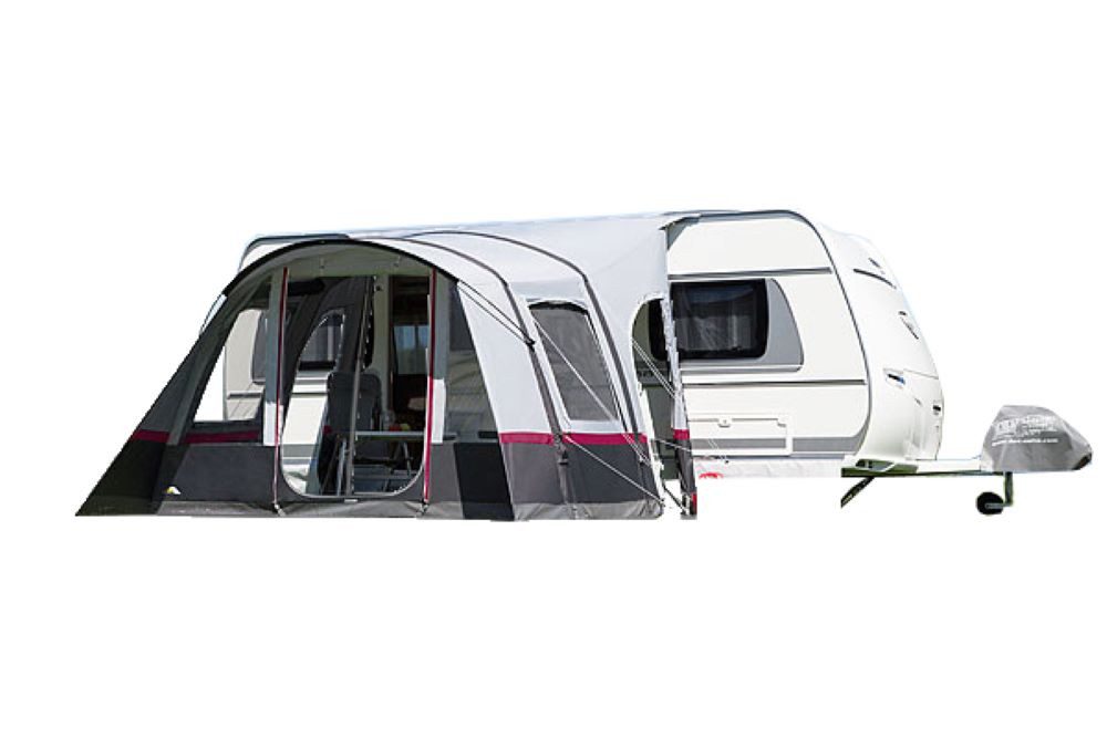 Das moderne Air-In-System aus hochwertigem HQ-Gewebe (High Quality) ermöglicht einen schnellen Aufbau. Große Zeitersparnis, weniger Handling, geringes Gewicht. Die beiden Luftkammern werden einfach mit der Doppelhubpumpe mit Luft gefüllt. Der Eingang in der Vorderwand hat zusätzlich einen Gazeeinsatz, der zum Lüften dient und Mücken fernhält. Die serienmäßigen Air-In Distanzpolster werden mit Klettverschlüssen befestigt und spannen das Dach in der Tiefe für mehr Stabilität. Die Fensterklappe in der Seitenwand ist hochrollbar oder als Lüftungshaube ausstellbar. Die Lüftungshaube sorgt bei schlechtem Wetter für eine gute Belüftung im Zelt. Komplett geschlossen. Die von innen angebrachten Gardinen schützen vor neugierigen Blicken.