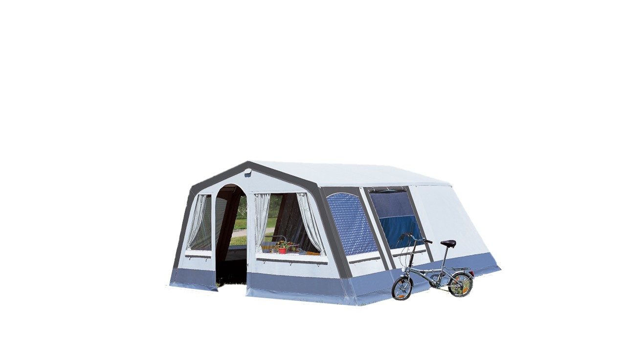 Dach aus Vollsynthetik, außenseitig beschichtet; Wände aus trailtex- Gewebe, außenseitig beschichtet, lichtecht, strapazierfähig und leicht; hochgezogener Spritz- und Erdstreifen aus beidseitig beschichtetem Polyestergewebe.