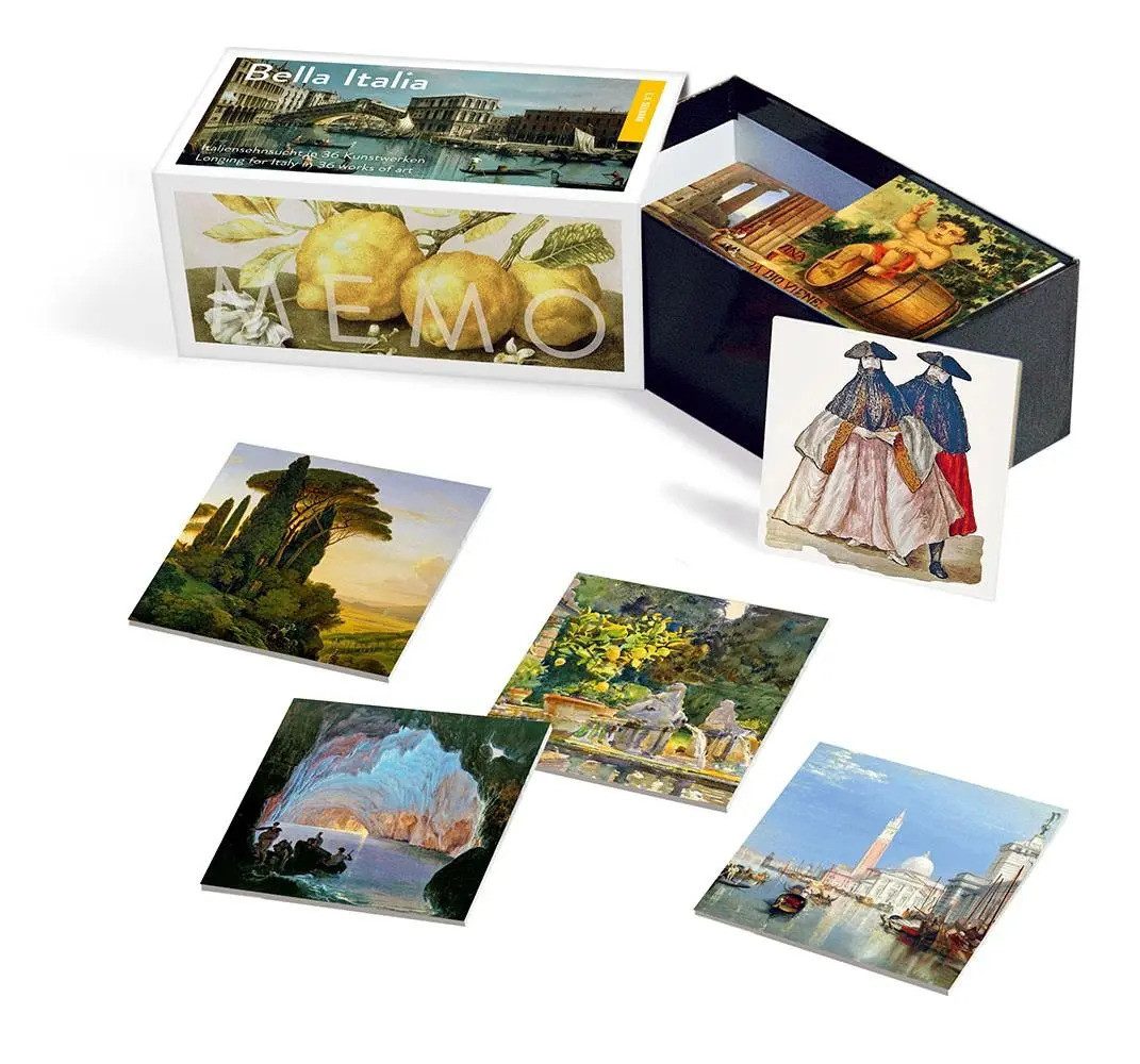 All jene, die das Fernweh packt, nimmt dieses Memo-Spiel mit auf eine Reise in das Land der Sonne. Mit Italien verbinden sich spätestens seit Goethes berühmter Reise südliche Sehnsuchtsbilder von blühenden Zitronenbäumen und herrlichen Landschaften. Spielerisch gilt es hier, nicht nur Orte wie Florenz, Rom, Neapel oder Capri zu entdecken, sondern auch ganz unterschiedliche Sichtweisen auf Italien in der Kunst. Künstlergenerationen von der Renaissance über die Romantik bis hin zum Expressionismus waren von Italien magisch anzogen und hielten ihre Eindrücke in Bildern fest. Sie verewigten idyllische Naturansichten, antike Tempel, spektakuläre Vulkanausbrüche und opulente Mahlzeiten. Mit Werken von Künstler:innen wie Caravaggio, Monet, Caspar David Friedrich, Gabriele Münter oder Wassily Kandinsky geht es in ligurische Fischerdörfer, an den Rand des Vesuv, an die Amalfiküste, nach Sizilien oder in die römische Campagna.
