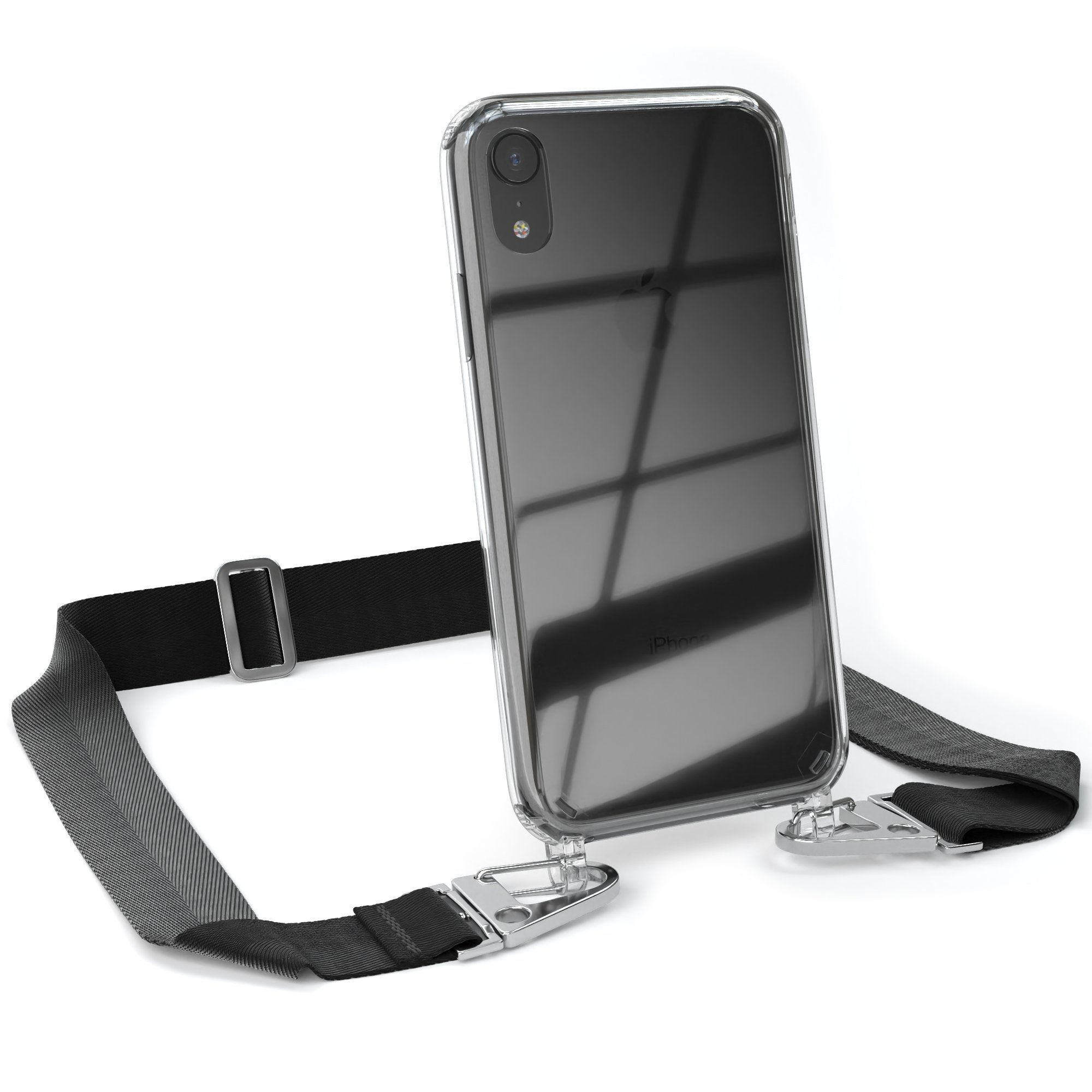 Lieferumfang | 1x Handyhülle Transparent mit Breitband + Karabiner, 1x Mikrofasertuch |