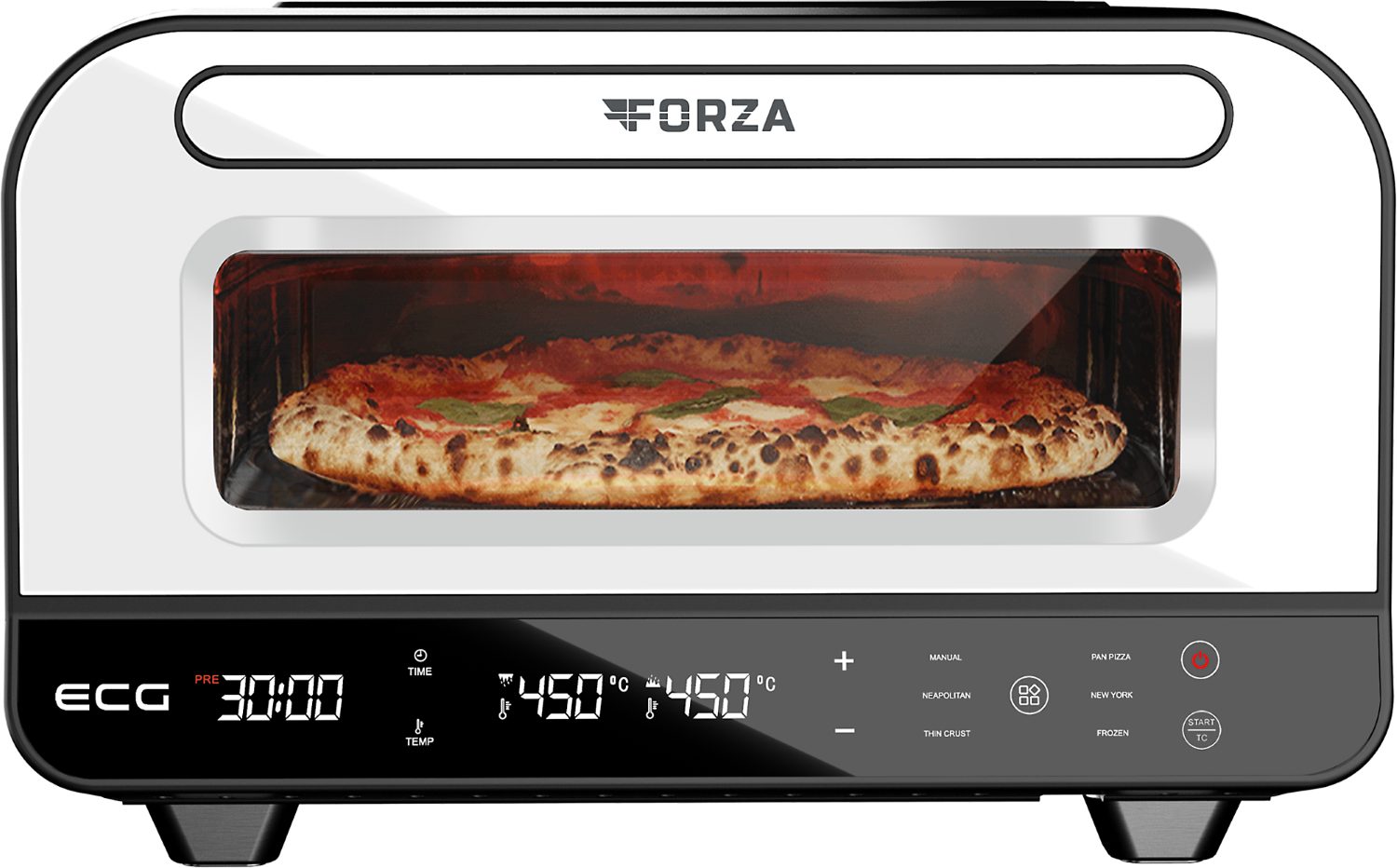 Впередe Vorteile | 5 voreingestellte Automatikmodi für die optimale Einstellung der Parameter (Temperatur und Zeit der Ober- und Unterhitze) für verschiedene Pizzasorten – Neapolitanisch, Dünner Boden, Pfannenpizza, New York und Tiefkühlpizza |