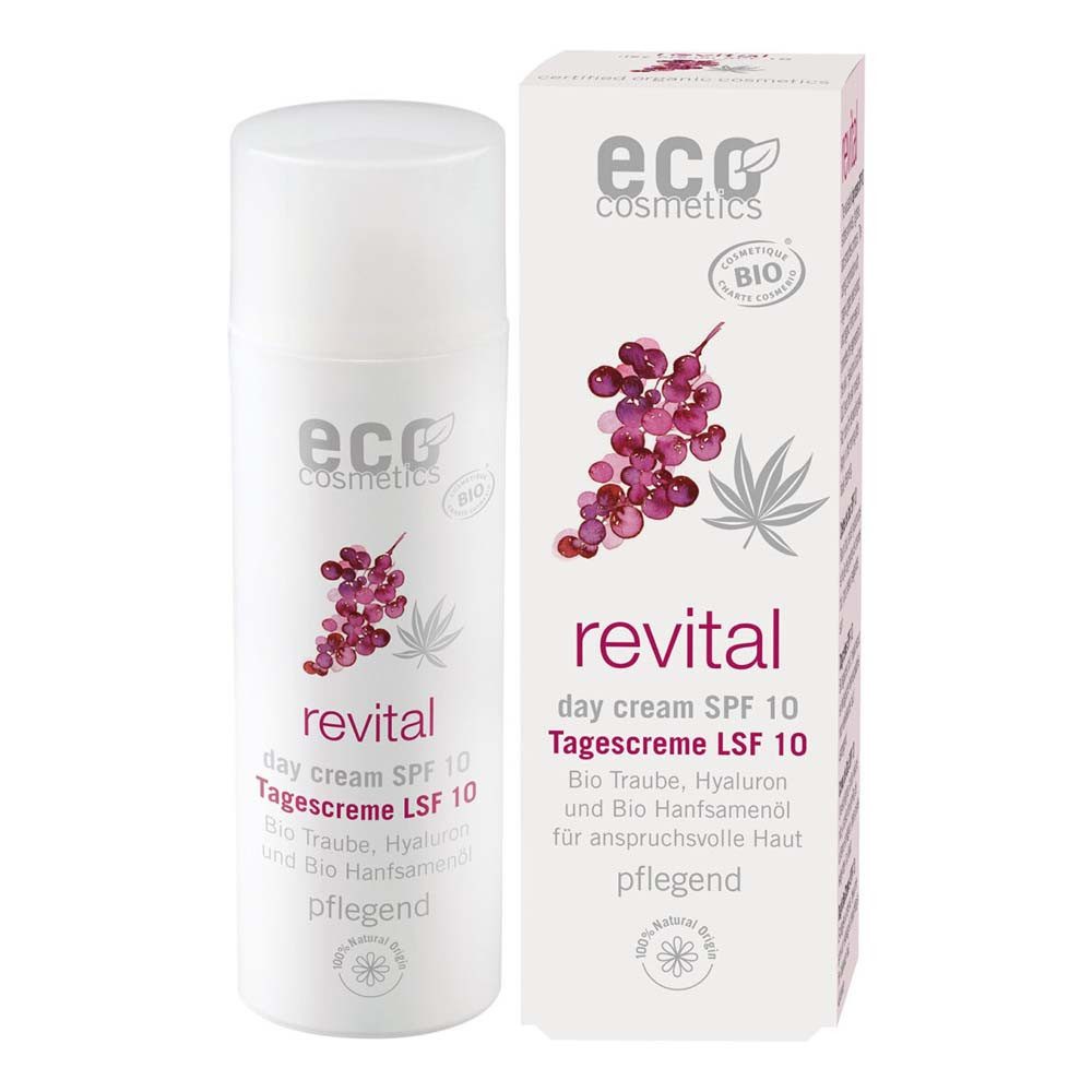 Die ECO revital Tagescreme LSF 10 mit Bio Traubenkernextrakt, Hyaluronsäure und Bio Hanfsamenöl ist die ideale Tagespflege für anspruchsvolle Haut. Sie mildert Fältchen, strafft und glättet Konturen. Die hochwertige Tagescreme mit wertvollem OPC (Oligomere Proanthocyanidine) aus Bio Traubenkernen schützt die Haut vor freien Radikalen und hemmt Oxidationsprozesse. Der Pflegekomplex aus Bio Traubenkernextrakt und Bio Hanfsamenöl fördert die Regeneration der Haut. Hyaluronsäure und Q10 sorgen für Elastizität und Spannkraft. Für einen natürlich-frischen Look.