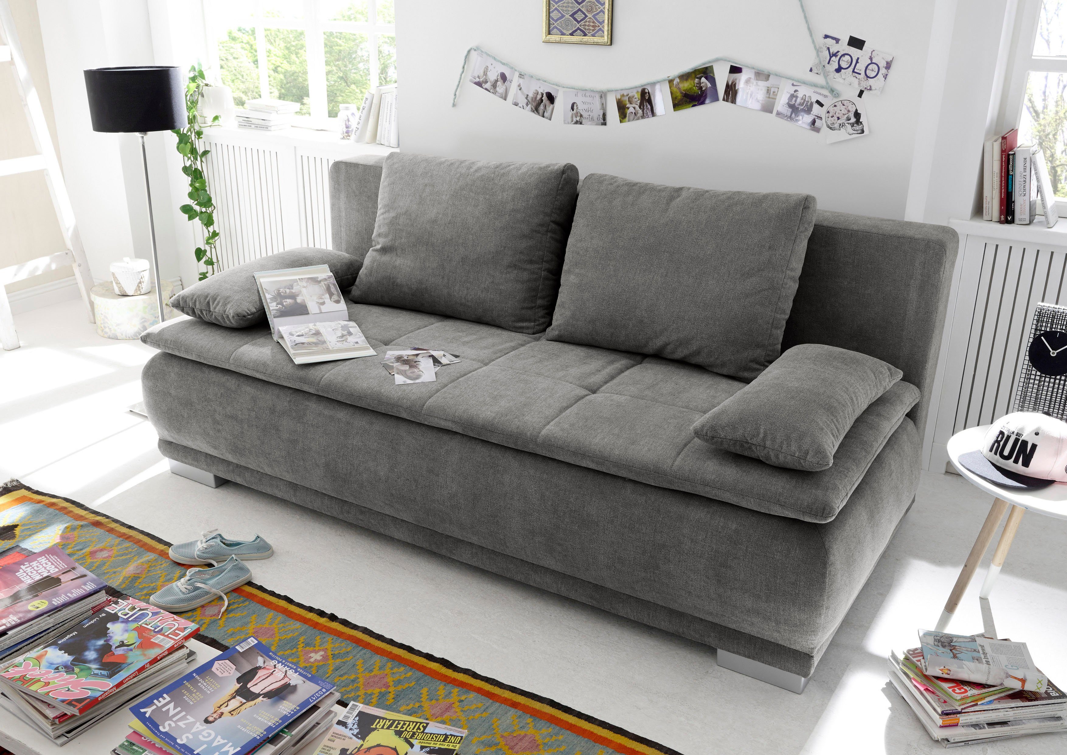 Wissenswertes | Bonellfederung in Sitz und Rücken inkl. 2 Armlehnkissen (35x62cm) inkl. 2 Rückenkissen (66x52cm) inkl. Bettkasten inkl. Schlaffunktion mit Liftbeschlag inkl. fest vernähter Schaumtopper |