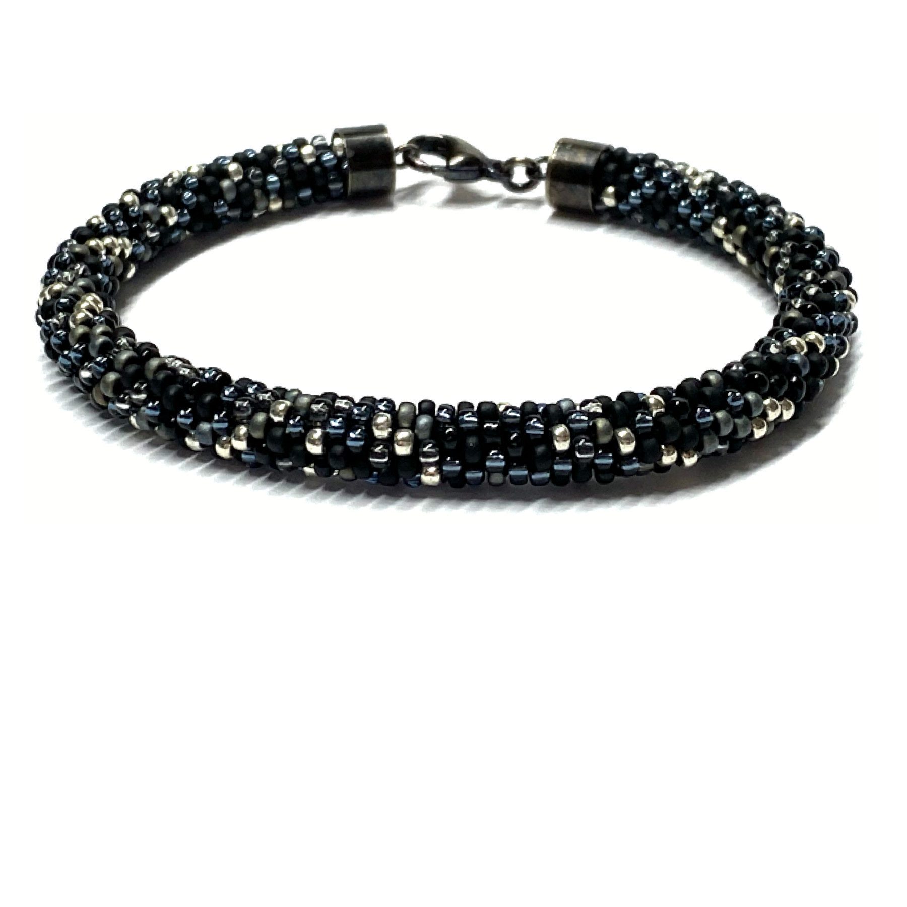 Der Verschluß besteht aus echt Sterling Silber Kapseln und einen stabilen Karabiner mit Gegenöse, die in ihrer Oberfläche geschwärzt wurden. Die passende Halskette finden Sie ebenfalls in meinem Shop.