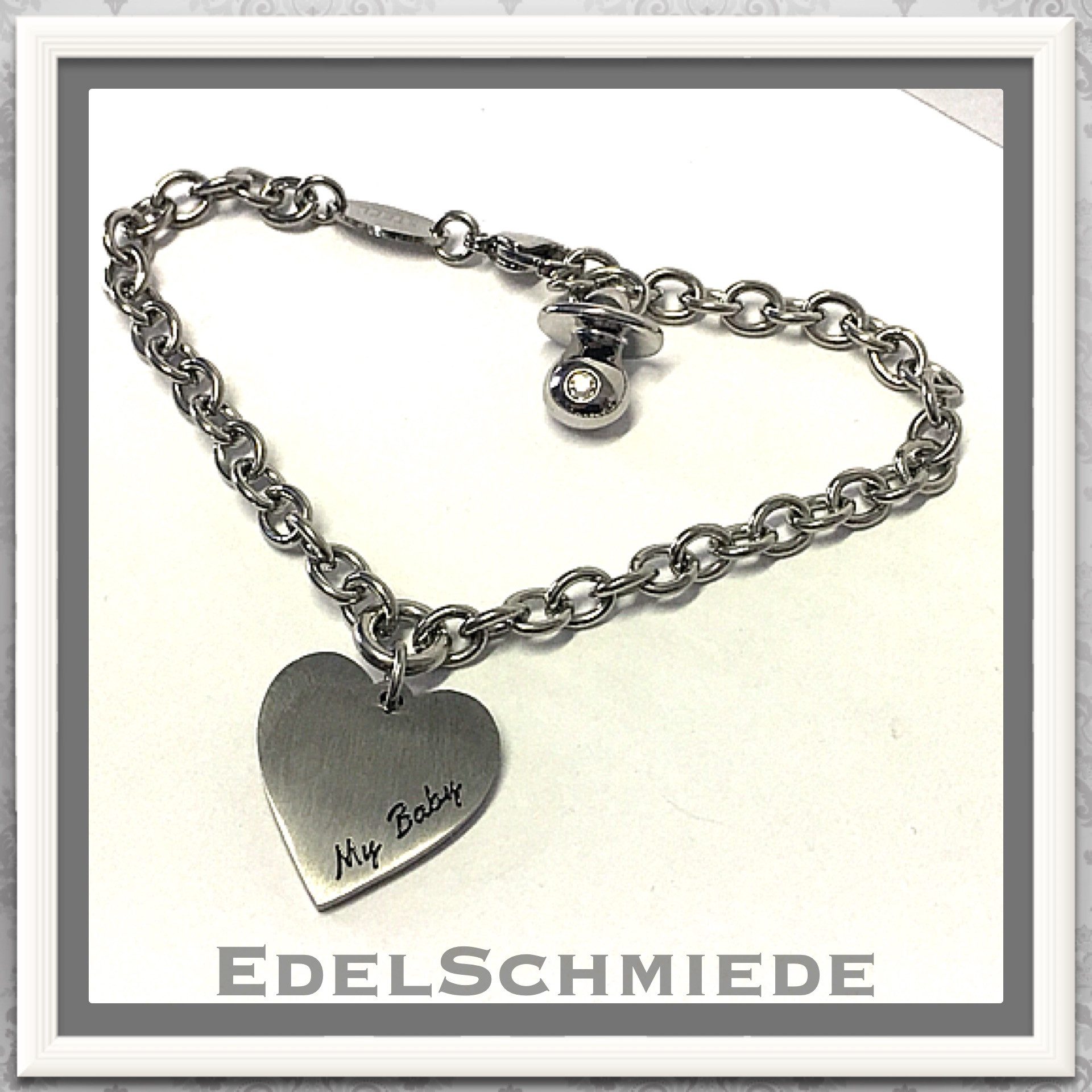 Dieses edle Armband ist aus Edelstahl gefertigt. Hierbei sind an einem massiven Ankerarmband zwei Einhänger integriert. Zum einen ein Schnuller mit einem neutralen Zirkonia und zum anderen ein mattiertes Herz mit der Aufschrift: my baby. Dieses Herz kann gern auf der Rückseite graviert werden. Möglich sind hierbei Buchstaben und Zahlen in Schreibschrift. verschlossen wird das Armkettchen mit einem stabilen Karabiner und einer Gegenöse. Gesamtgewicht: 12,6 g Довжина: 19 cm (kann kürzer Getragen werden) Herz: 18,5 x 19 mm