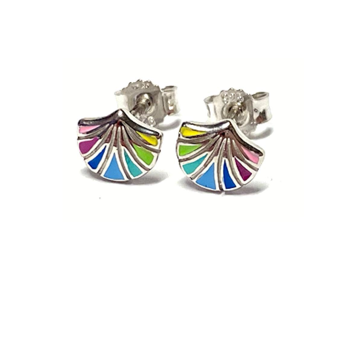 Diese schlichten Ohrringe sind aus 925/- Sterling Silber gefertigt und wurden abschließend, als Anlaufschutz, rhodiniert. Dargestellt ist eine Muschelform, die mit vielen bunten Farben aufgehübscht ist