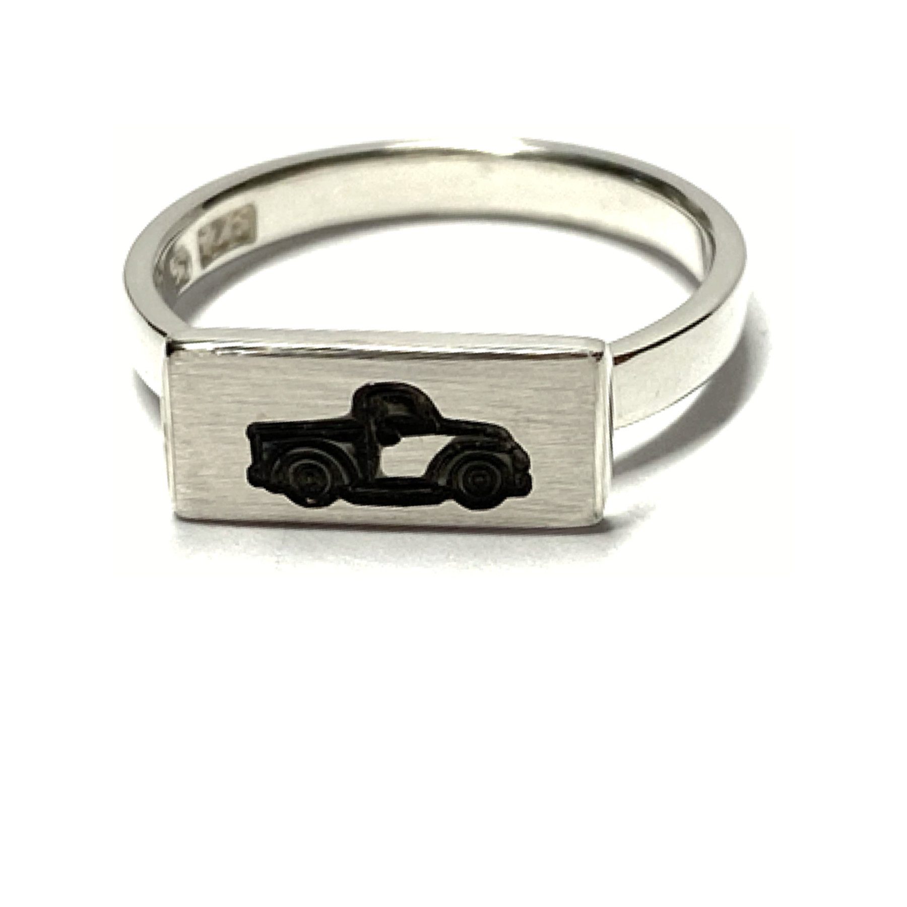Dieser ausgefallene Fingerring ist aus 925/- Sterling Silber gefertigt und hat auf der Oberseite ein PickUp eingeprägt. Die Oberfläche ist mattiert, so dass sich der dunkelere (geschwärzte) Oldtimer sehr gut abhebt. Die restliche, gleichbreit verlaufende Ringschiene ist hochglanz poliert.