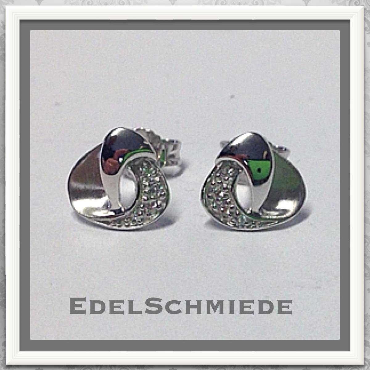 Diese schlichten Ohrringe sind aus 925/- Sterling Silber gefertigt und wurden abschließend, als Anlaufschutz, rhodiniert. Es scheint, als wären hier drei Stränge zu einem Knoten . Ein Strang ist poliert, einer mattiert und einer der Stränge ist komplett ausgefasst mit Zirkonias. So lassen sie sich wunderbar zu sehr vielen anderen Schmuckstücken kombinieren.