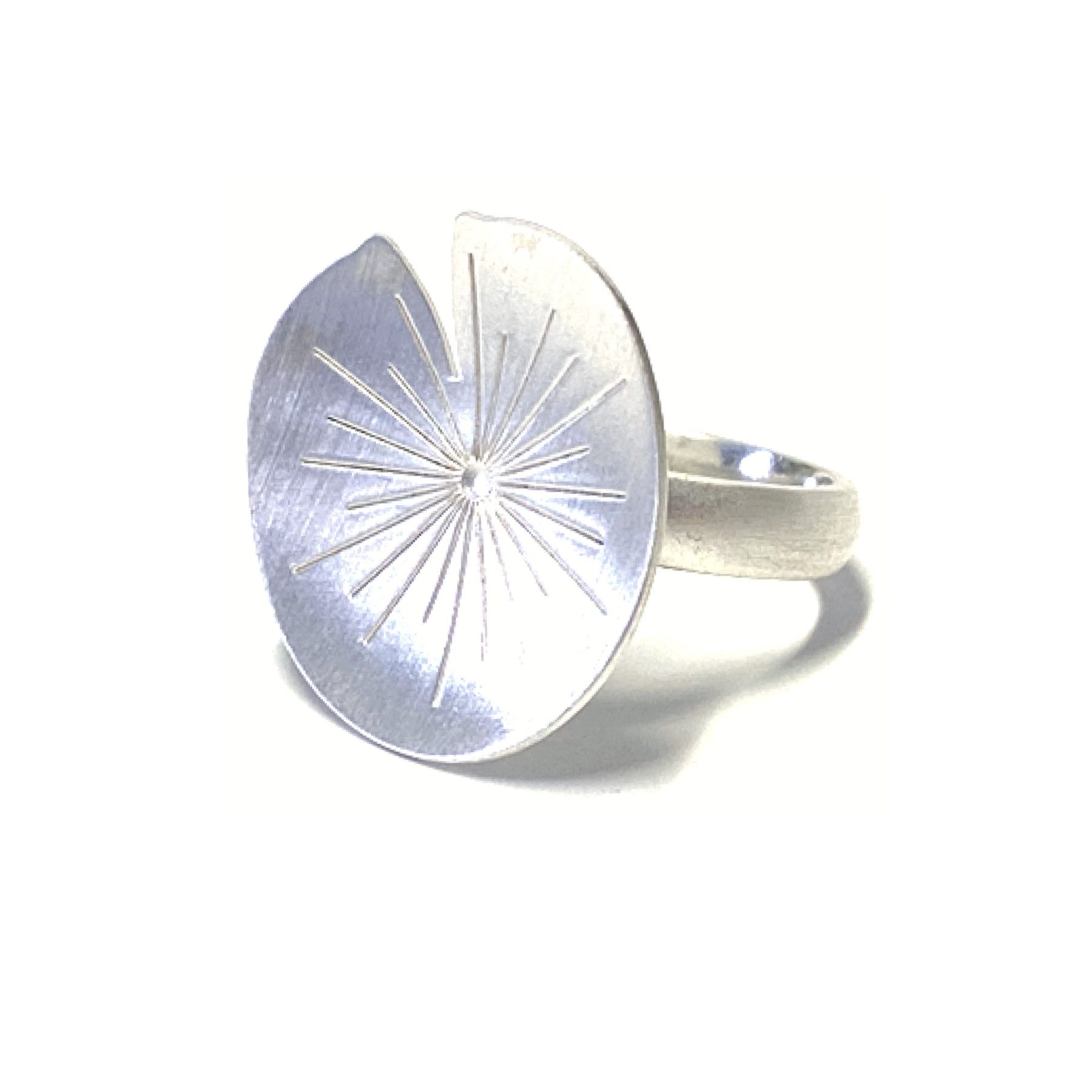 Dieser tolle Fingerring ist aus 925/- Sterling Silber gefertigt. Er zeigt ein tolles Seerosenblatt, dessen Oberfläche komplett mattiert ist. Die Ringschine unterhalb ist ein sehr stabiler Bandring aus ebenfalls mattiertem Silber 925.