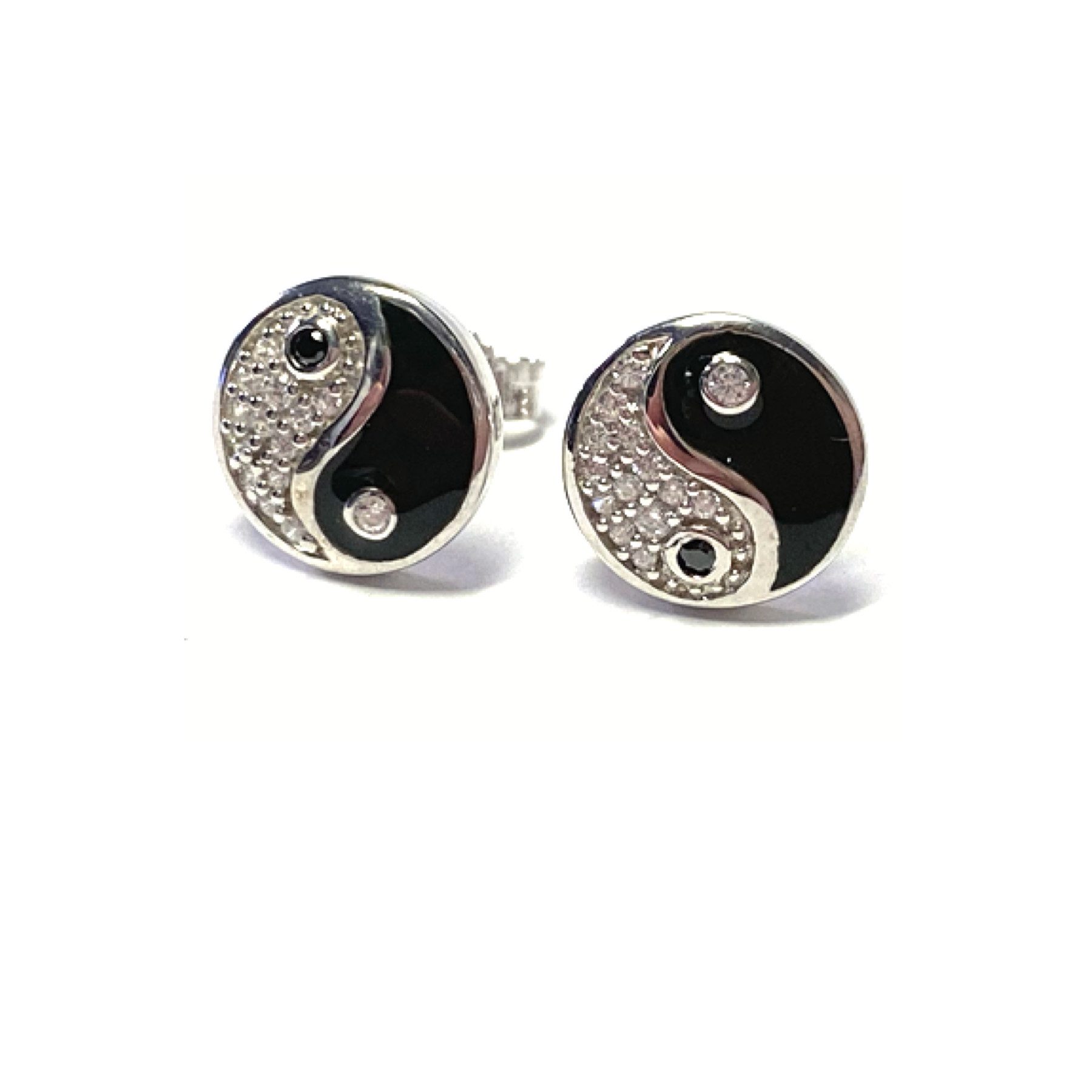 Diese Ohrringe sind aus 925/- Sterling Silber gefertigt und wurden abschließend, als Anlaufschutz, rhodiniert. Sie haben schwarzen Emaillelack aufgebracht und als Kontrast hierzu sind weiße funkelnde Zirkonia eingefasst. Dargestellt ist das klassische Yin Yang Motiv. Der Ohrsteckerstift ist mittig auf der Rückseite angebracht, so dass beim Tragen das Ohrloch wunderbar verdeckt wird.