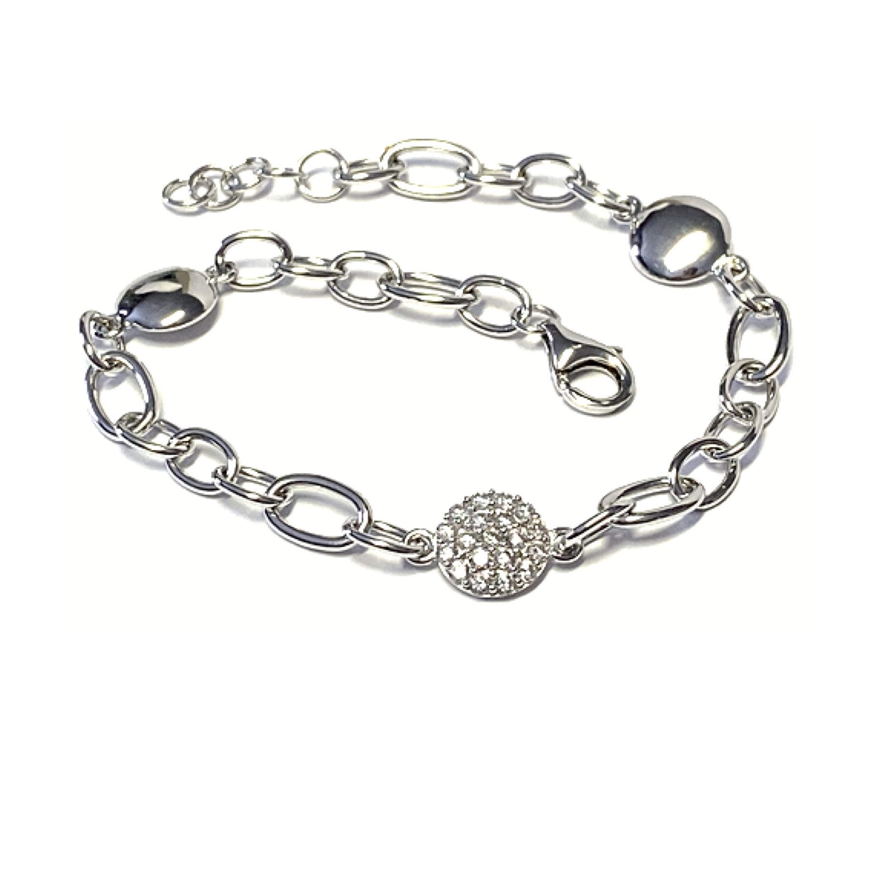 Dieses tolle Armband ist aus 925/- Sterling Silber gefertigt und wurde abschließend, als Anlaufschutz, rhodiniert. Es ist in seiner Oberfläche komplett poliert. Die Elemente sind alle miteinander beweglich verbunden, was das Tragen sehr angenehm macht. Verschlossen wird das Armkettchen mit einem stabilen Karabiner und einem Verlängerungskettchen, bei dem die Довжина selbst passend festgelegt werden kann. Dezente Schmuckelemente verfeinern den Look des Armband und eines davon ist mit funkelnden Zirkonias ausgefasst.