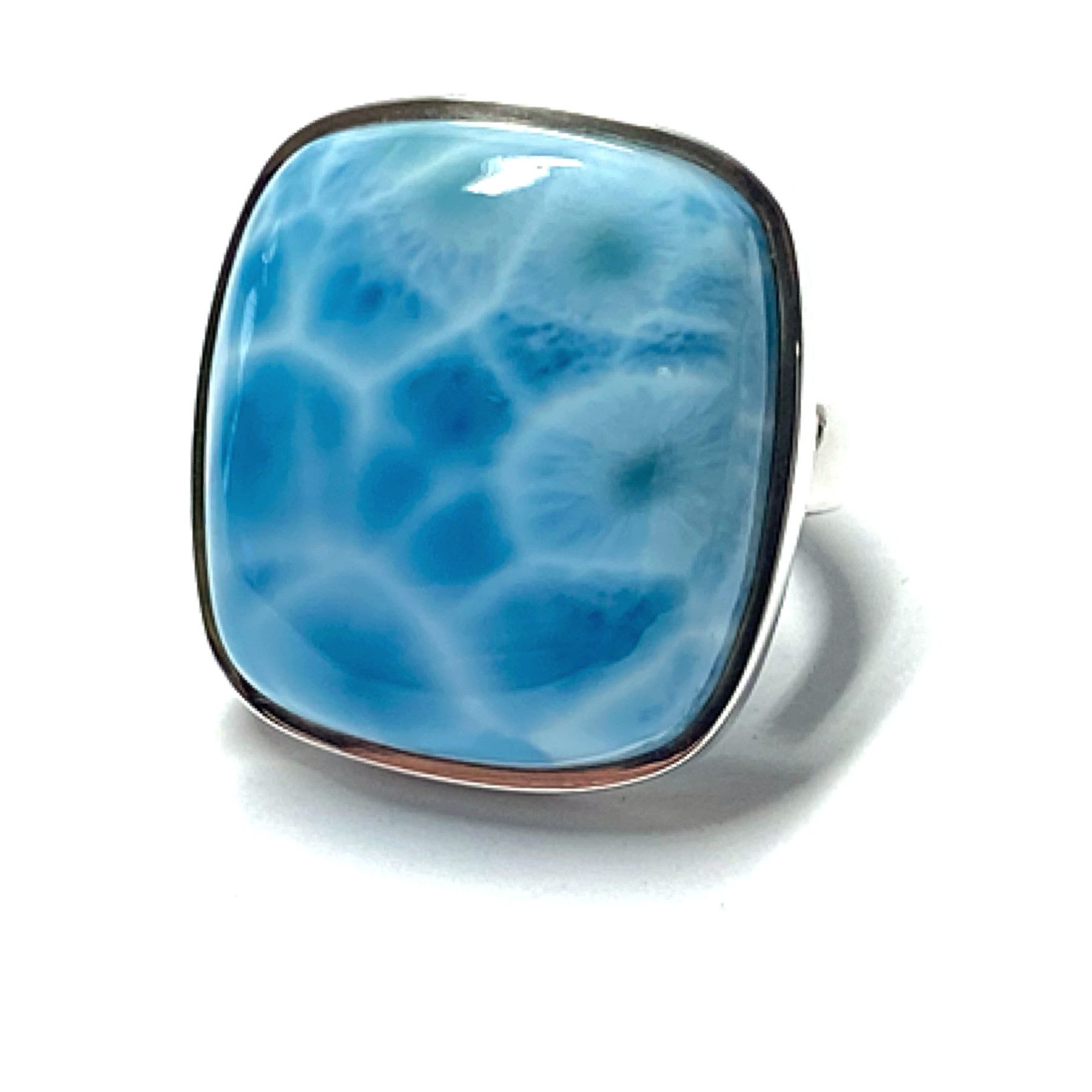 Dieser edle Fingerring ist aus 925/- Sterling Silber gefertigt. Auf der stabilen, aber offenen Schiene ist ein toller, eckiger Larimarcabochon sicher aufgesetzt. Der Edelstein sitzt in einer Zargenfassung. Die Oberflfäche des Ringes ist komplett Hochglanz poliert.