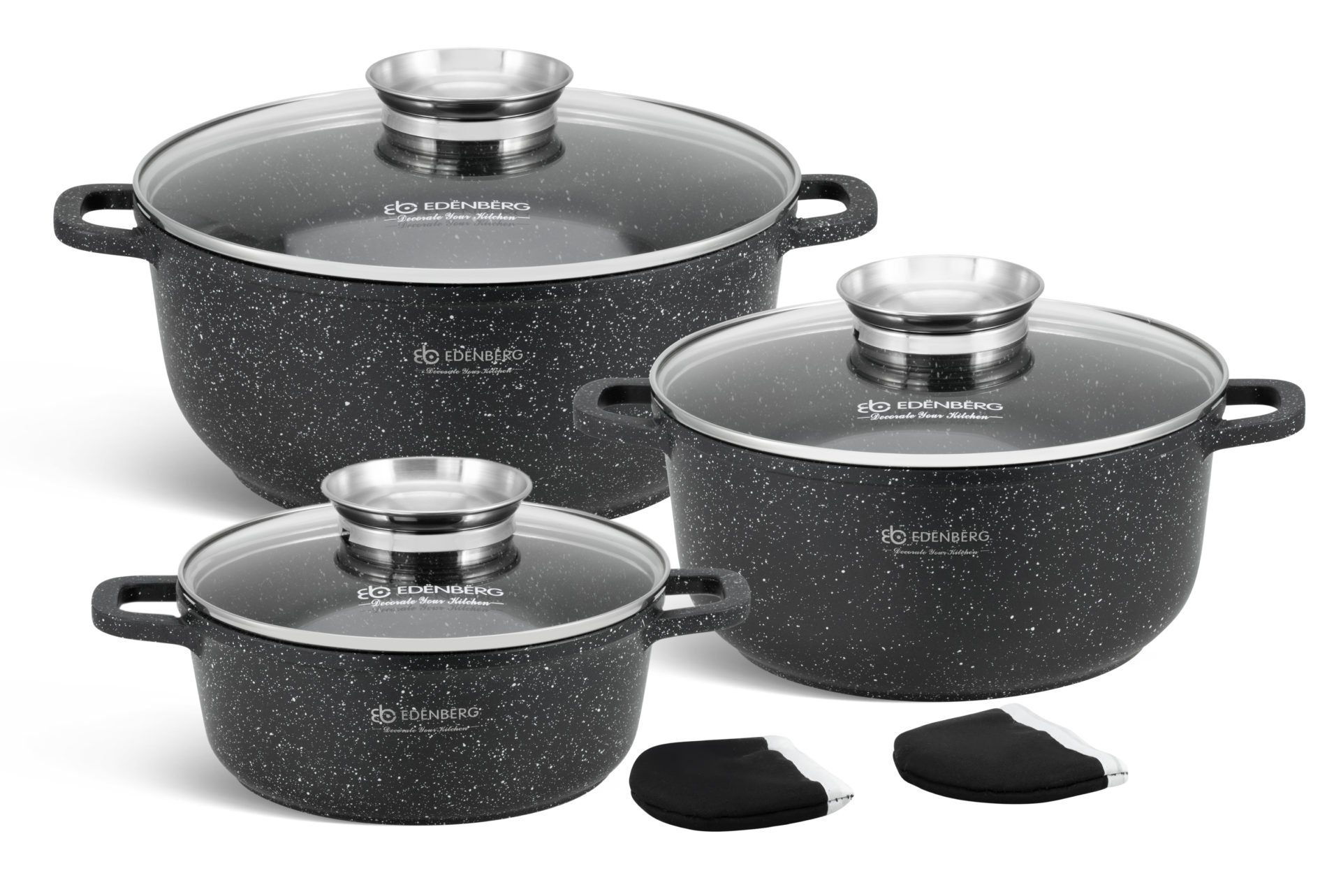 Eigenschaften | Für alle Herdarten geeignet: Induktion, Gas, Elektro, Halogen und Ceran (Glaskeramik) Material: Hochwertiges, gepresstes Aluminium – leicht, stabil und langlebig Beschichtung: Keramik-Granit mit Antihaft-Effekt – besonders kratzfest und fettarmes Kochen möglich Hoch hitzebeständig: Backofengeeignet bis 250 °C (Topf) / 180 °C (Deckel) Schnelle und gleichmäßige Wärmeverteilung dank innovativem 9-lagigem Boden Wärmespeichernd: Der Boden speichert die Hitze und hält Speisen länger warm Metallgriffe: Robust und ofenfest – Nutzung mit Schutzhandschuhen empfohlen Deckel aus gehärtetem Glas mit Dampfloch für kontrolliertes Dampfgaren Modernes Design: Eleganter Look, passt in jede Küche Komfortable Handhabung: Inklusive 2 Silikon-Schutzkappen für sicheres Anfassen heißer Griffe Kratzfest & pflegeleicht – ideal für den täglichen Einsatz Zwei Set-Варіантиn verfügbar: 3-teilig: 6,8 L / 4,5 L / 2,3 L 4-teilig: für noch mehr Flexibilität |