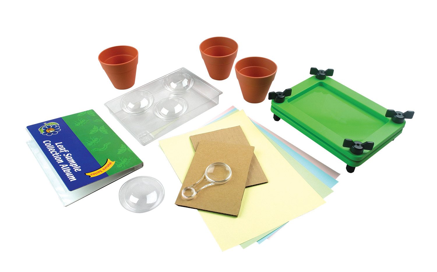 Eigenschaften | Inhalt: Blumenpresse, Pressrahmen und Schrauben, drei Pflanztöpfen, vier Wasserschalen, Experimentierbecken, Sammelmappe für Presswerke, Löschpapier, Hintergrundpapier. |
