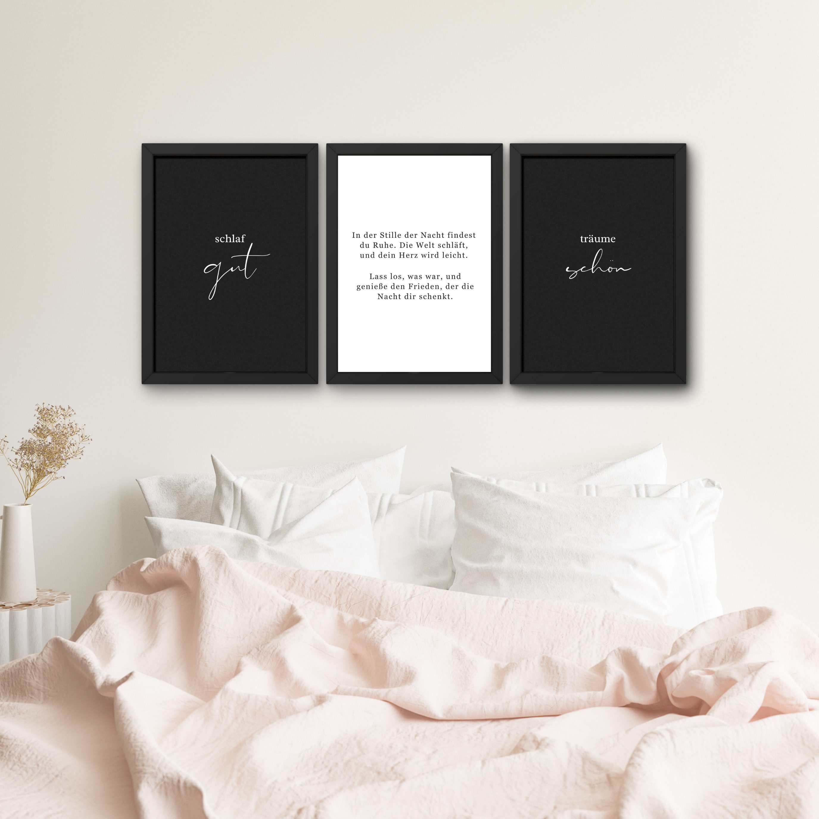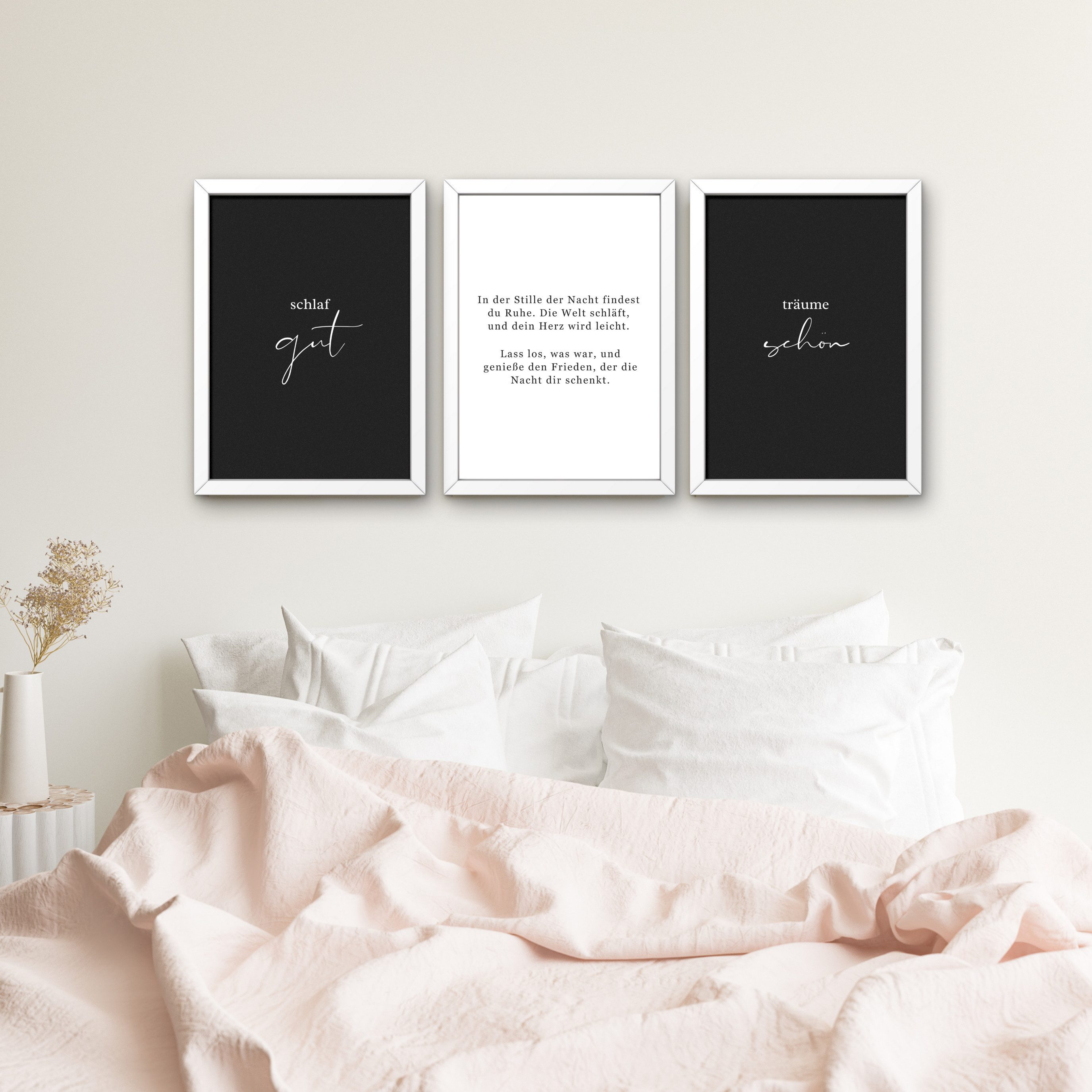 Bringe Ruhe und Harmonie in dein Schlafzimmer mit dem „Schlaf gut, träume schön“ 3er-Poster-Set. Die minimalistischen Schwarz-Weiß-Designs mit sanften Botschaften sorgen für eine entspannte Atmosphäre und verwandeln deine Wände in eine stilvolle Wohlfühloase. Das Set wird inklusive hochwertigem Rahmen in Schwarz oder Weiß geliefert – du kannst also sofort dekorieren, ohne einen passenden Rahmen suchen zu müssen! Die Kunstdrucke im Format 30x40 cm werden auf 250 g/m² Premium-Papier gedruckt und bieten eine brillante, matte Optik.