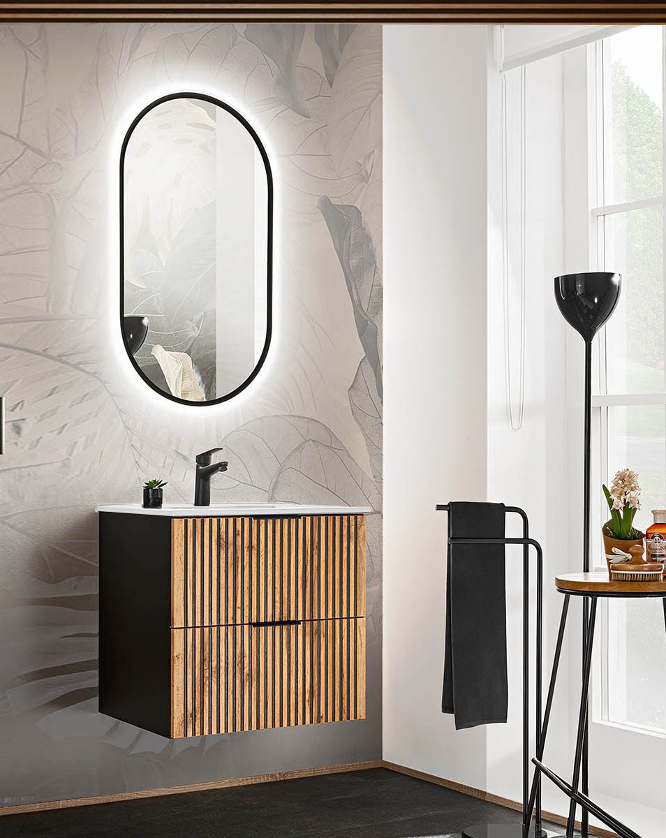 Set beinhaltet | Waschtisch 60cm mit Keramik Einbaubecken weiß und LED Spiegel |