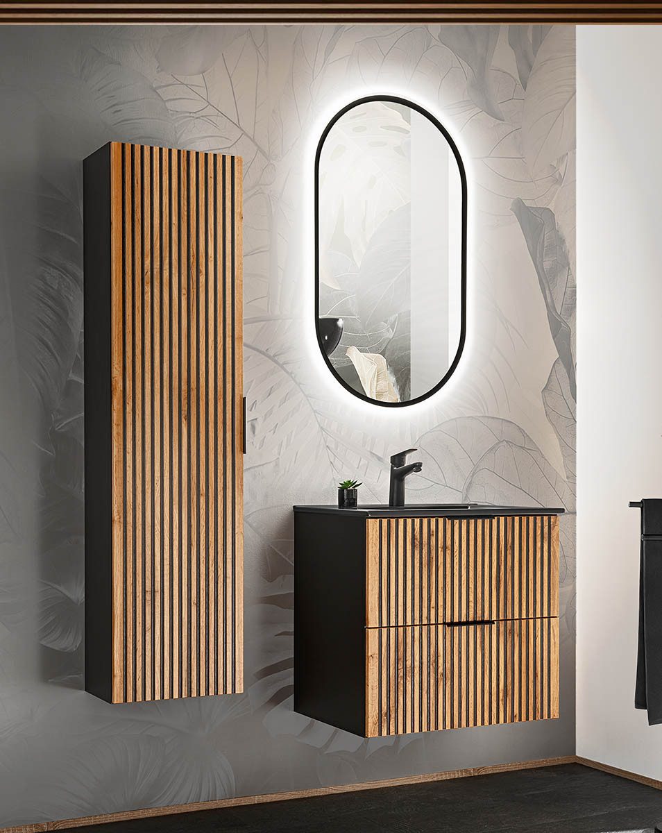 Set beinhaltet | Waschtisch 60cm mit Keramik Einbaubecken black, LED Spiegel und Hochschrank |
