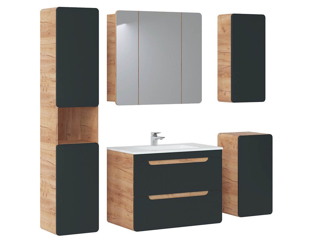 Set beinhaltet | Waschtisch Unterschrank, mit Keramikwaschbecken, Spiegelschrank, Hänge-und Seitenschrank, Hochschrank |