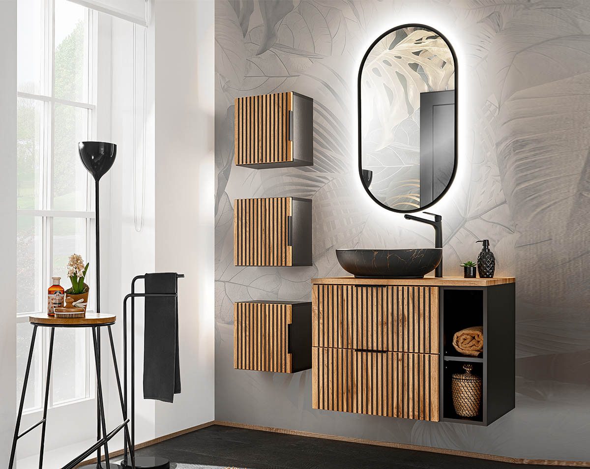 Einen fantastischen Kontrast haben die Designer der Badmöbel-Sets "tribune" hier geschaffen. Das kühle mattschwarz der Möbelkorpusse trifft auf die lebendig gemaserte, vom Ton sehr warme, Eiche im "Wotan" Look. Die echte Säge-Schnittkanten nachempfundene Holzoptik wirkt lebendig und schafft, im optischen Zusammenspiel mit den vertikal gefrästen Vertiefungen in Riemchenoptik, ein nie da gewesenes Raumerlebnis. Die Waschtische mit oder ohne Waschbecken sind in Größen von 60cm bis 160cm erhältlich und füllen damit jedes Bad. In Kombination mit den quadratischen Hänge- und den voluminösen Hochschränken ensteht Stauraum der gefällt!