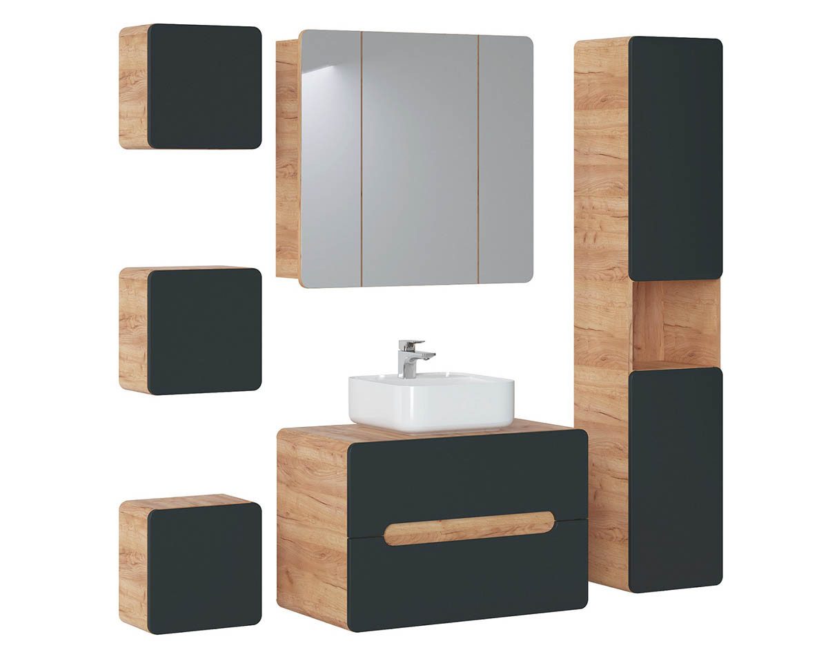 Set beinhaltet | Waschtisch Unterschrank, mit Aufsatzbecken, Spiegelschrank, 3x Hängeschrank, Hochschrank |