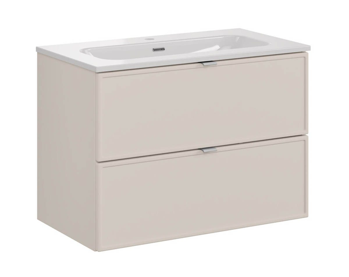 Die BELEZA Bad-Kollektion ist eine harmonische Mischung aus modernen Trends und klassischer Eleganz. Die Möbel sind in einem dezenten Kaschmir-Finish gehalten, welches Ihrem Bad einen weichen, harmonischen Charakter verleiht. Die markanten Fronten mit gefrästem Rahmenmuster sorgen für eine edle Note.