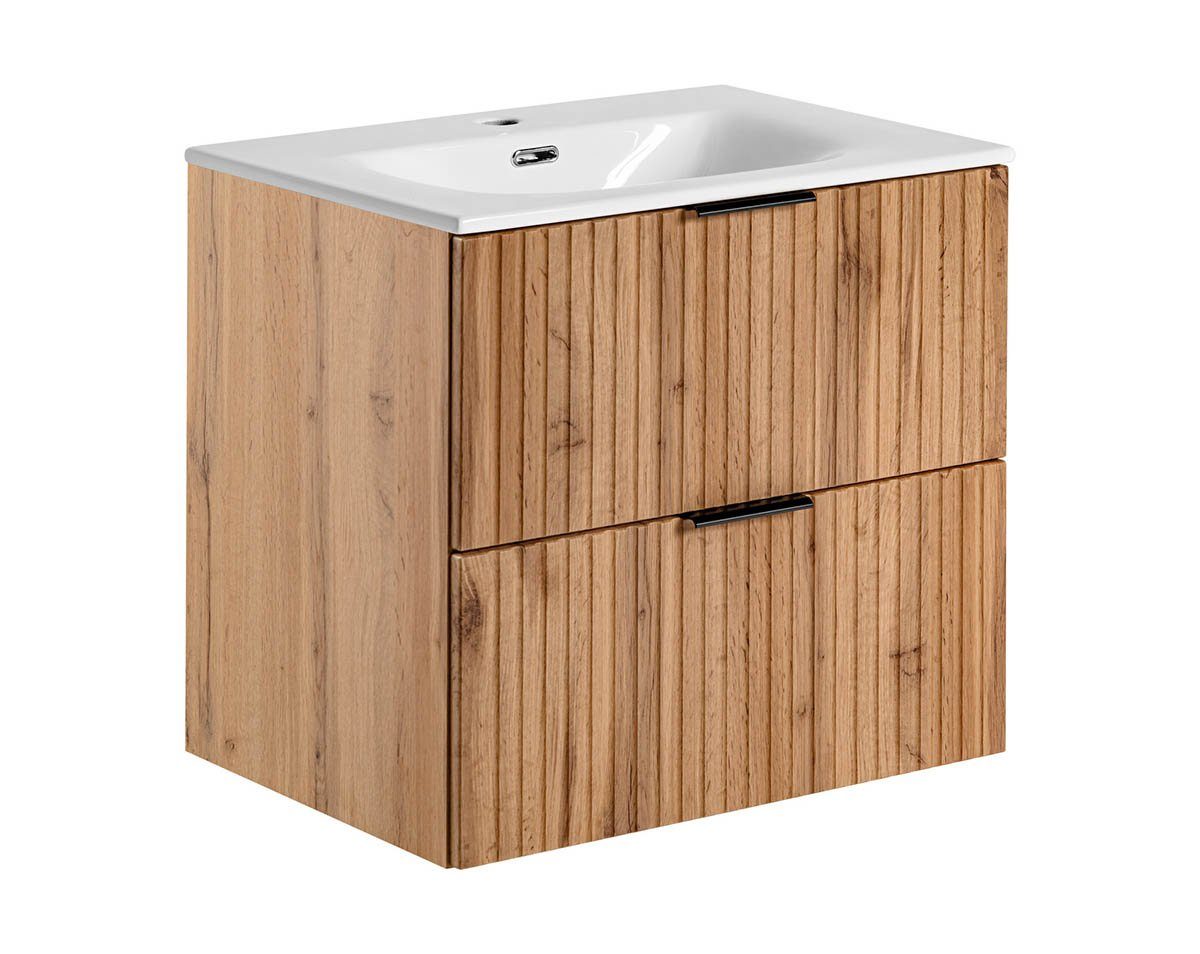 Die 60cm Waschtische mit Einbaubecken der PORTREE Badserie verbinden natürlich anmutende Oberflächen mit zeitgemäßen optischen Raffinessen. Die Unterschränke, deren Korpus aus laminiertem Holzwerkstoff und Fronten aus MDF mit PVC Beschichtung bestehen, sorgen mit den vertikal gefrästen Vorderseiten für ein Highlight in jedem Bad. Die Waschplätze sind auch im Set erhältlich.