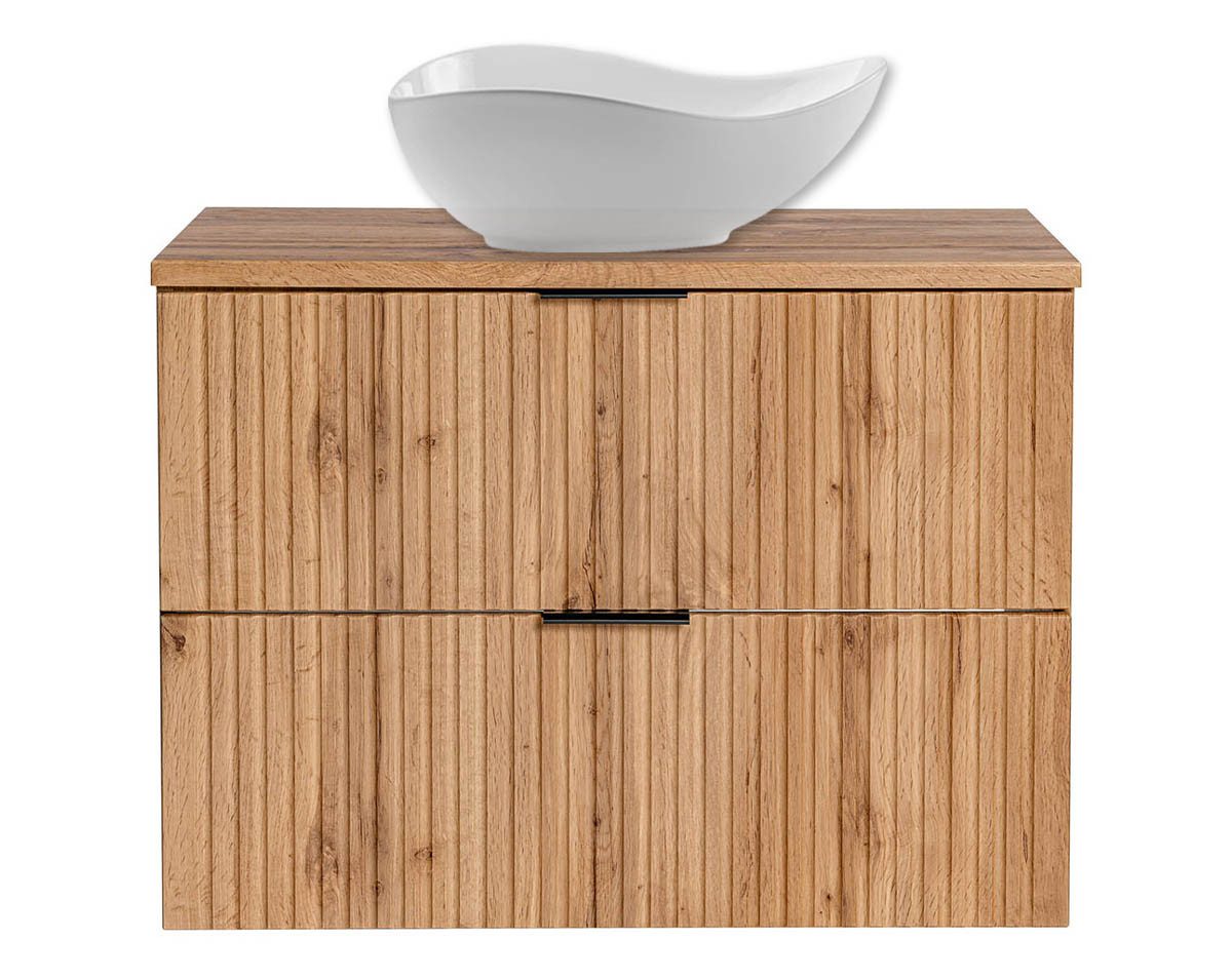 Die 80cm Waschtische mit Aufsatzbecken der PORTREE Badserie verbinden natürlich anmutende Oberflächen mit zeitgemäßen optischen Raffinessen. Die Unterschränke, deren Korpus aus laminiertem Holzwerkstoff und Fronten aus MDF mit PVC Beschichtung bestehen, sorgen mit den vertikal gefrästen Vorderseiten für ein Highlight in jedem Bad. Die Waschplätze sind auch im Set erhältlich.