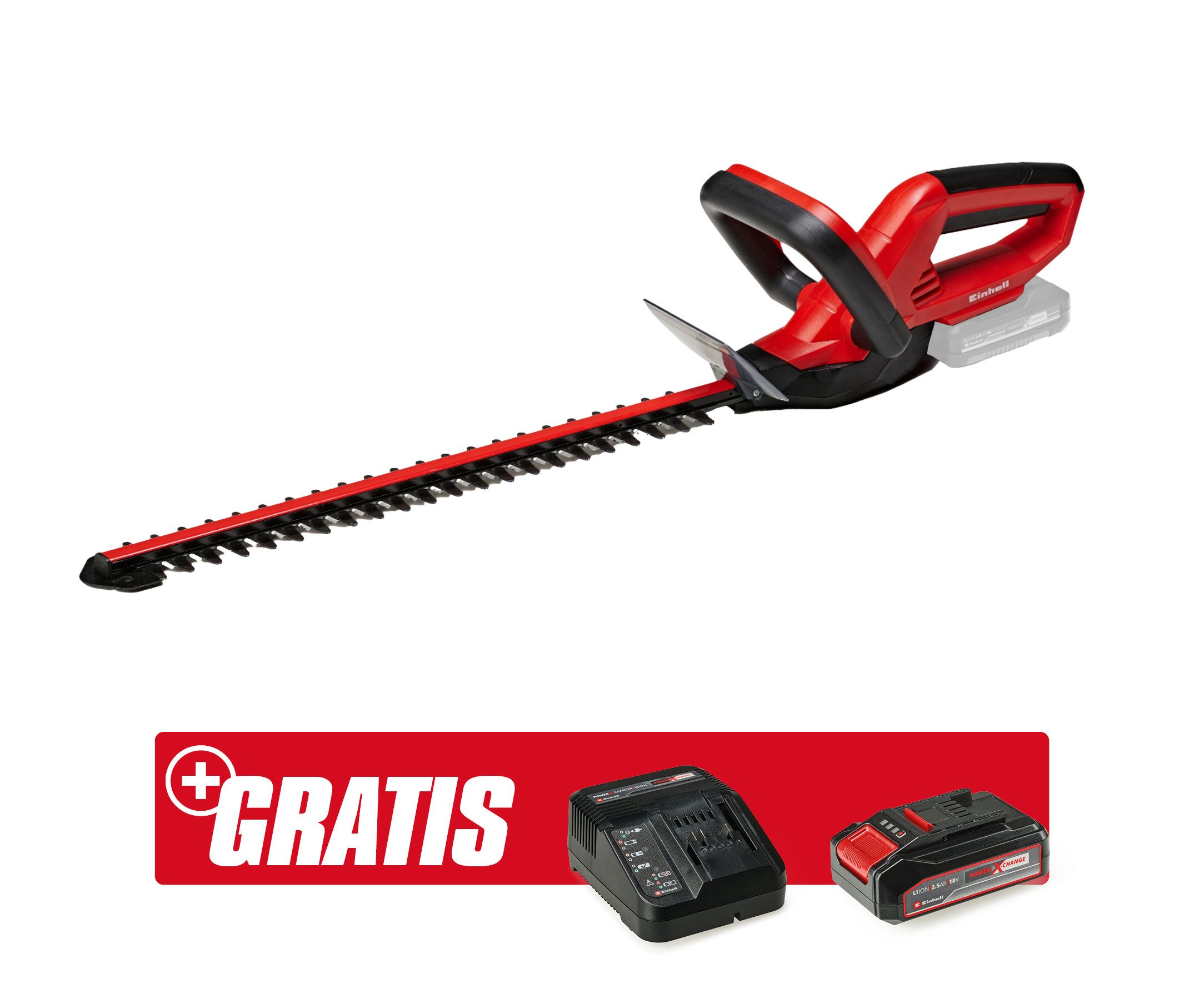 Lieferumfang | 1x 18V 2,5Ah PXC Starter Kit (Akku & Ladegerät) 1x Akku-Heckenschere Messerschutz |