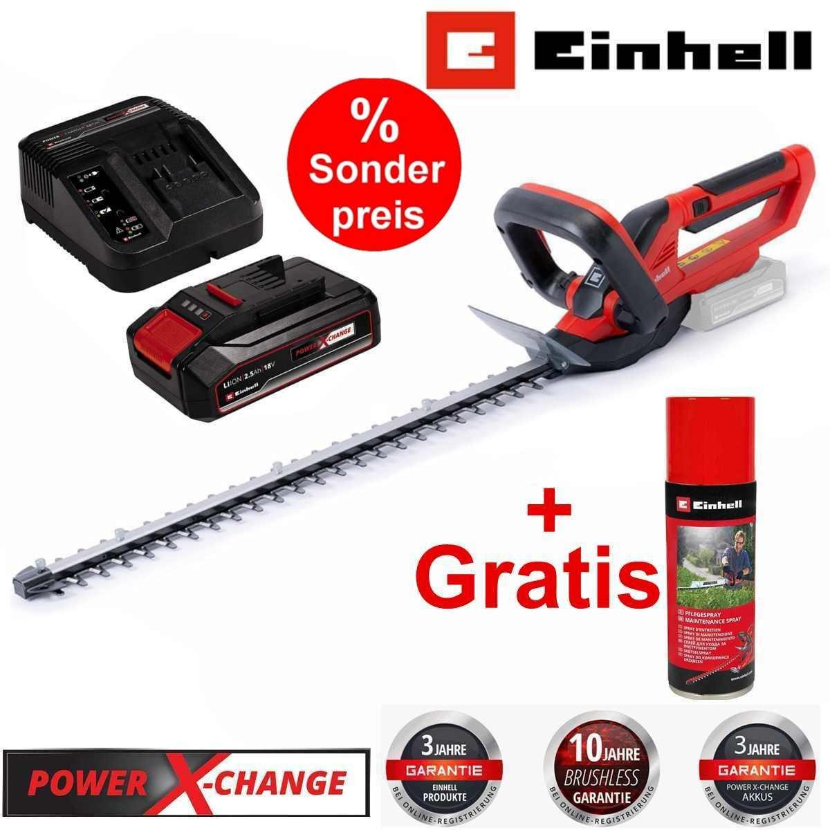 Einhell Akku-Heckenschere GC-CH 1855/1 Li Kit Power X-Change (18 V, 55 cm Schnittlänge, 18 mm Zahnabstand, drehbarer Handgriff, Schnittgutsammler, inkl. 2,5 Ah Akku & Ladegerät) + Pflegespray