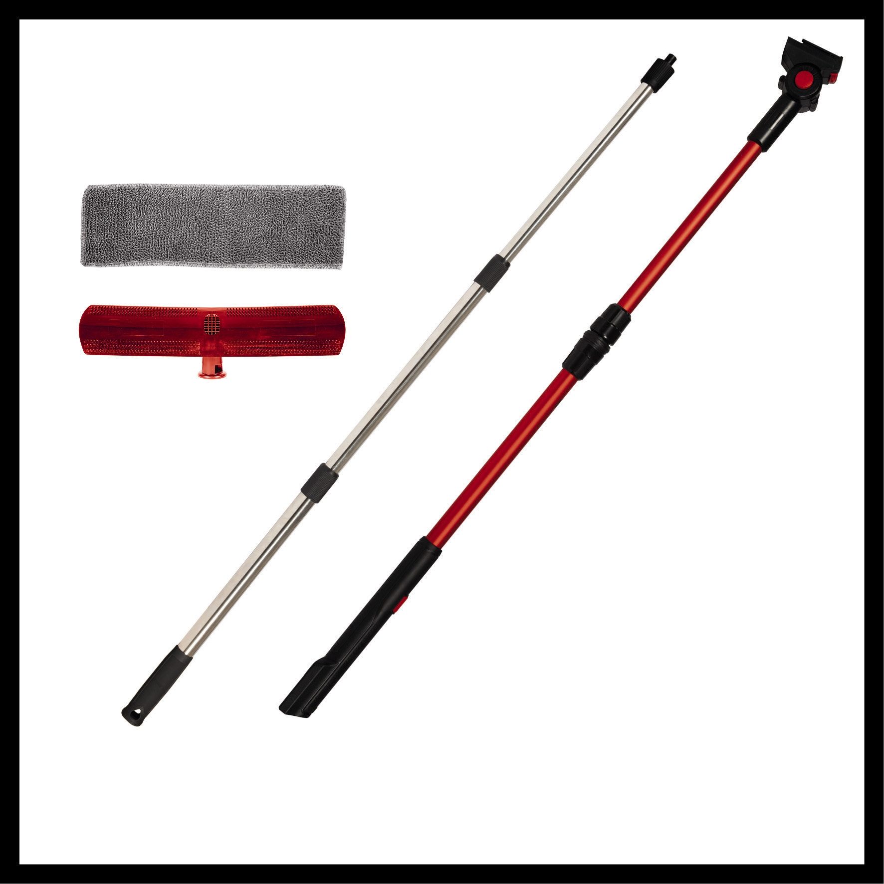 Das Original Einhell Teleskopstangenset ist eine Erweiterung für den Einhell Akku-Fensterreiniger BRILLIANTO. Mit Hilfe der Teleskopstangen kann der Fenstersauger noch flexibler zum Einsatz kommen, um zum Beispiel hohe Fenster, Schaufenster, Glas-Überdachungen, Wintergärten oder schwer zugängliche, hoch gelegene Fenster im Treppenhaus zu reinigen. Das Set besteht aus einem Mikrofasertuch und zwei Teleskopstangen – eine als Verlängerung für den Akku-Fensterreiniger und eine Stange mit Aufsatz für das Wischpad. Beide Teleskopstangen können bis ca. 120 cm stufenlos eingestellt werden. Die Verlängerung für den Fensterreiniger kann unkompliziert am Gerät befestigt werden, indem sie direkt in dessen Akku-Aufnahme geschoben wird. Der benötigte Power X-Change Akku wird dann am unteren Ende der Teleskopstange eingeschoben, wodurch die Gewichtsverteilung optimiert wird. Dort befindet sich zudem ein Ein-/Ausschalter, um den Akku-Fenstersauger auch am Boden, vom unteren Ende der Stange aus zu bedienen. Zusammen mit dem Softgrip behält man so während der Arbeit die maximale Kontrolle über das Gerät. Dank des Gelenks an der Teleskopstange kann der Neigungswinkel des Fensterreinigers optimal an die jeweiligen Begebenheiten angepasst werden. So liegt die Abziehlippe des Fensterreinigers immer im besten Winkel an der Scheibe an und sorgt für maximale Saugleistung und streifenfreie Ergebnisse.