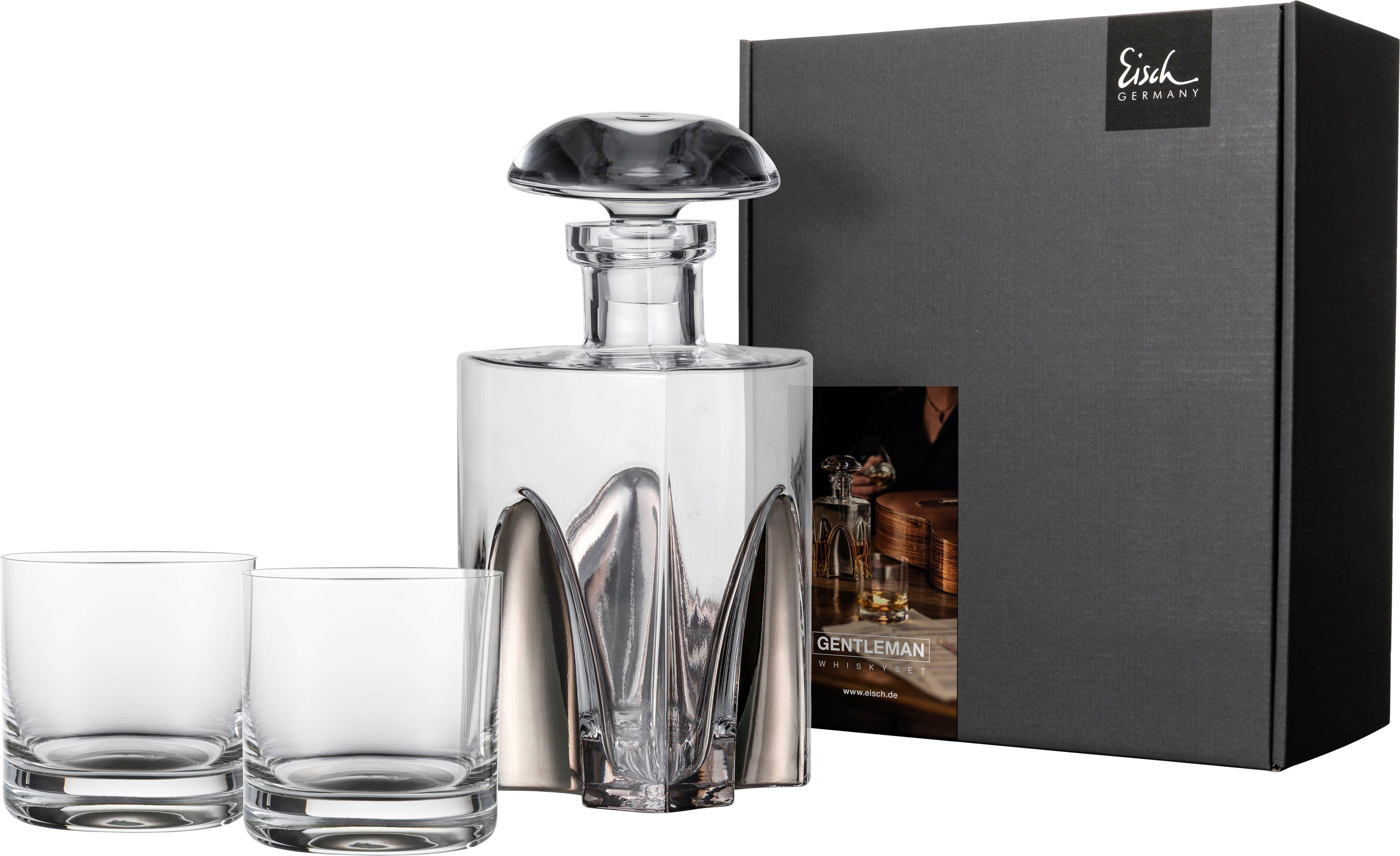 1 EISCH Whiskykaraffe und 2 Whiskybecher GENTLEMAN platin, veredelt mit Echtplatin, sind im schwarzen Geschenkkarton verpackt.