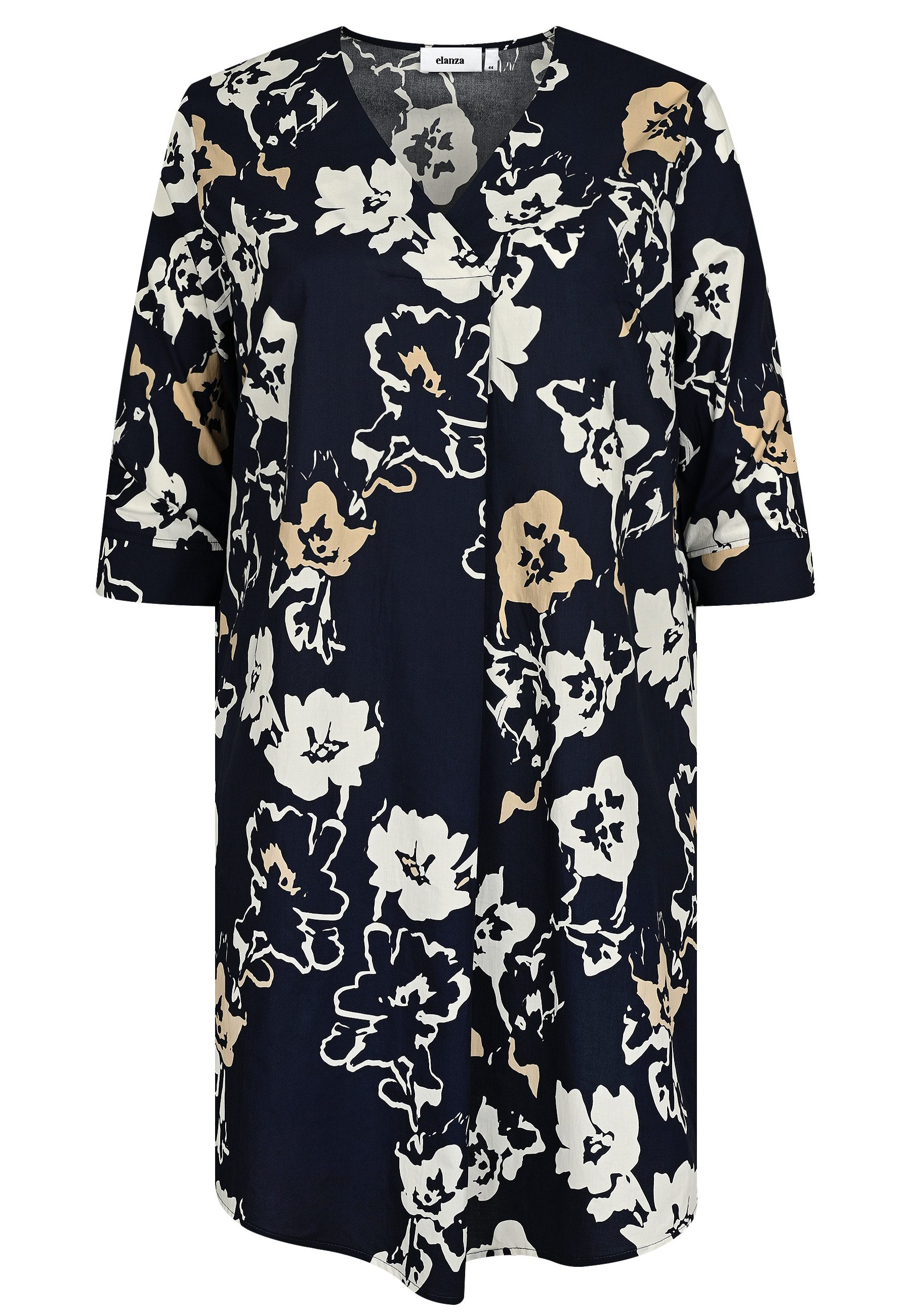 Mit diesem Kleid im Hemdblusen-Stil zeigt elanza ein tolles Allday-Modell für viele Anlässe. Der Schnitt ist angenehm locker und leicht ausgestellt, zwei seitliche Eingrifftaschen sind praktisch im Alltag und unterstreichen den lässigen Look. Ein tiefer V-Ausschnitt unterstreicht ein schönes Dekolleté und die tief gelegte Falte im Vorderteil schenkt zusätzliche Leichtigkeit und Bewegungsfreiheit. In tiefem Navy-Blau gehalten, kommen die Blüten in Weiß und Beige perfekt zur Geltung. Stylen Sie dieses Kleid aus reiner Baumwolle sporty zu Sneakern, leger zu Boots oder elegant zu Ballerinas oder Pumps. Ein Styling-Wunder, das Sie von Frühling bis Sommer lieben werden.
